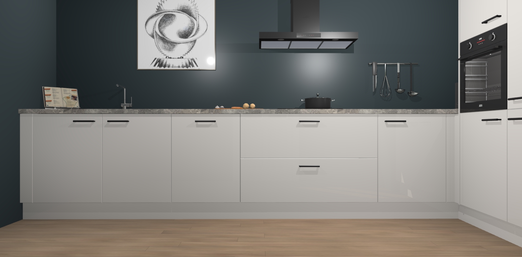 Welkom bij de Zijdegrijze hoogglans keuken Khao Lak. Deze prachtige keuken zal de komende jaren het middelpunt van de belangstelling in uw huis zijn. Uitgerust met vijf inbouwapparaten komt u nooit kookgereedschap tekort. Bovendien geeft de warme houtlook elke ruimte een uitnodigende en tijdloze uitstraling.