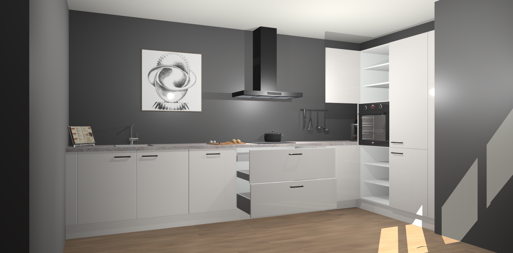 Welkom bij de Zijdegrijze hoogglans keuken Khao Lak. Deze prachtige keuken zal de komende jaren het middelpunt van de belangstelling in uw huis zijn. Uitgerust met vijf inbouwapparaten komt u nooit kookgereedschap tekort. Bovendien geeft de warme houtlook elke ruimte een uitnodigende en tijdloze uitstraling.