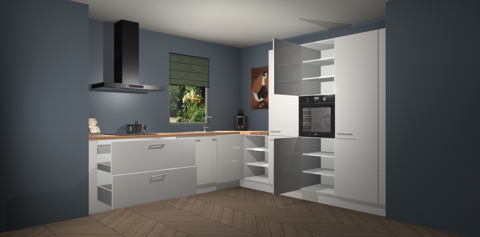 Welkom bij de Zijdegrijze hoogglans keuken Laos. Deze prachtige keuken zal de komende jaren het middelpunt van de belangstelling in uw huis zijn. Uitgerust met vijf inbouwapparaten komt u nooit kookgereedschap tekort. Bovendien geeft de warme houtlook elke ruimte een uitnodigende en tijdloze uitstraling.