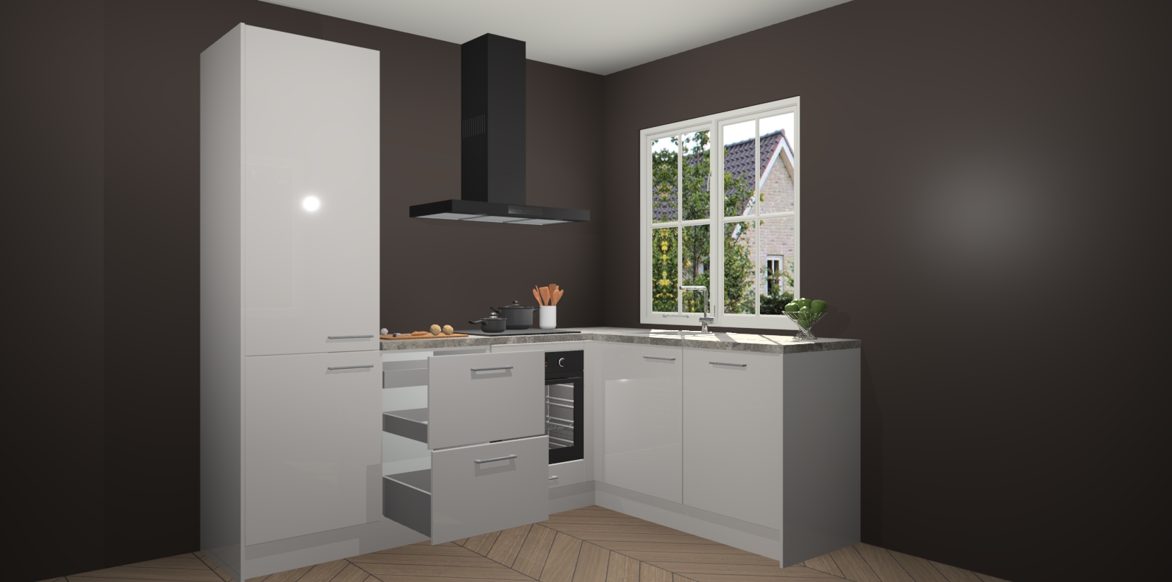 De Zijdegrijze hoogglans keuken Linz is de perfecte keuze voor uw nieuwe moderne en tijdloze keuken. Ga voor moderne en tijdloze elegantie in uw keuken. De prachtige hoekkeuken biedt een verfrissende kijk op de manier waarop we ons vertrouwde keukenontwerp kunnen aanpassen in een nieuwe stijl. Één blik om alles te zien: zo mooi dat het bijna magisch lijkt.