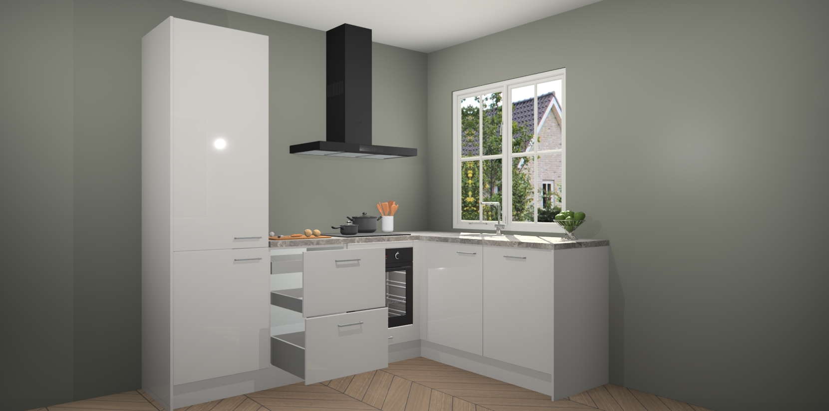 De Zijdegrijze hoogglans keuken Linz is de perfecte keuze voor uw nieuwe moderne en tijdloze keuken. Ga voor moderne en tijdloze elegantie in uw keuken. De prachtige hoekkeuken biedt een verfrissende kijk op de manier waarop we ons vertrouwde keukenontwerp kunnen aanpassen in een nieuwe stijl. Één blik om alles te zien: zo mooi dat het bijna magisch lijkt.