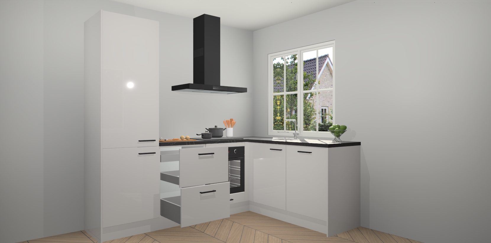 De Zijdegrijze hoogglans keuken Linz is de perfecte keuze voor uw nieuwe moderne en tijdloze keuken. Ga voor moderne en tijdloze elegantie in uw keuken. De prachtige hoekkeuken biedt een verfrissende kijk op de manier waarop we ons vertrouwde keukenontwerp kunnen aanpassen in een nieuwe stijl. Één blik om alles te zien: zo mooi dat het bijna magisch lijkt.