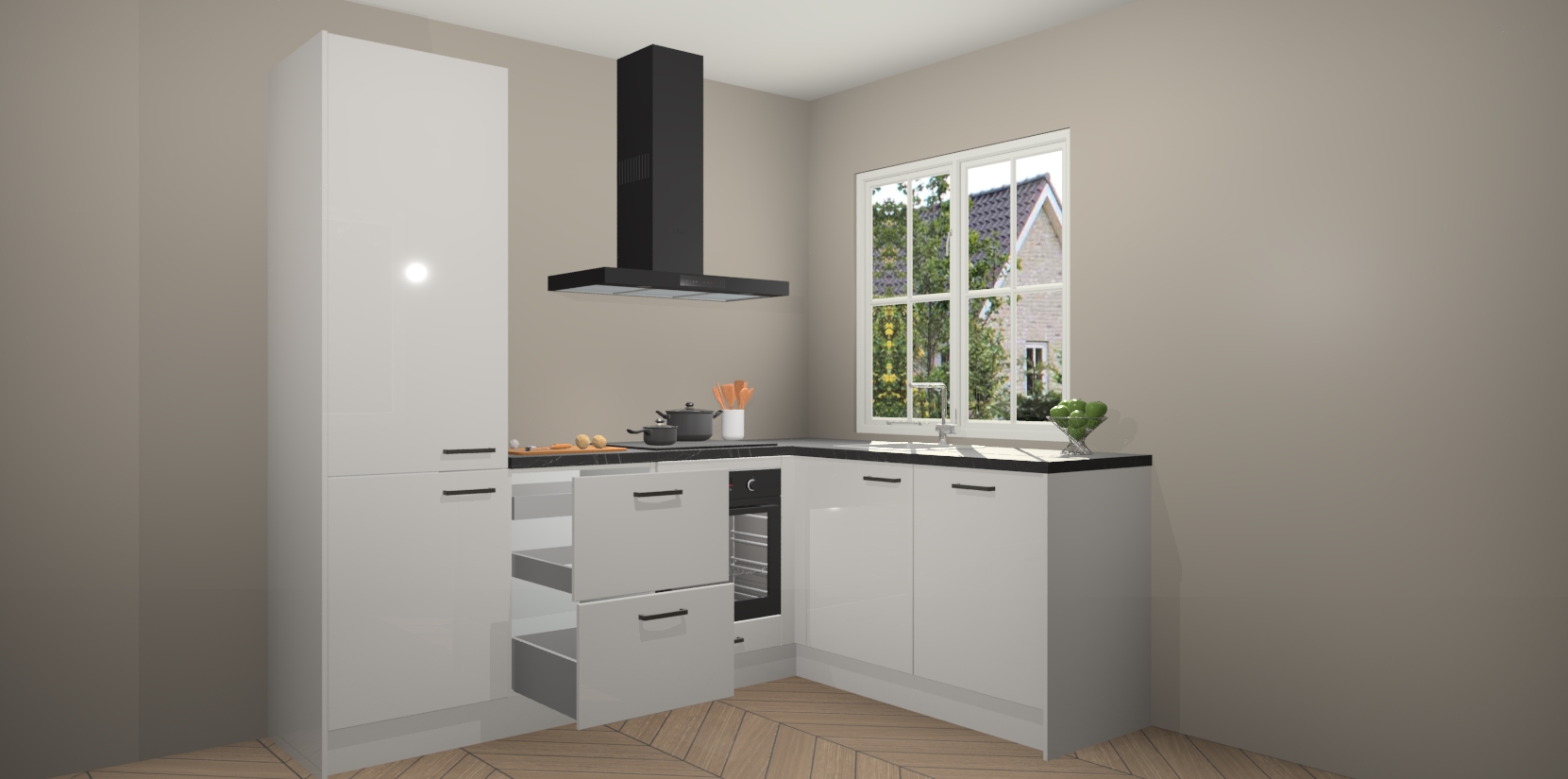 De Zijdegrijze hoogglans keuken Linz is de perfecte keuze voor uw nieuwe moderne en tijdloze keuken. Ga voor moderne en tijdloze elegantie in uw keuken. De prachtige hoekkeuken biedt een verfrissende kijk op de manier waarop we ons vertrouwde keukenontwerp kunnen aanpassen in een nieuwe stijl. Één blik om alles te zien: zo mooi dat het bijna magisch lijkt.