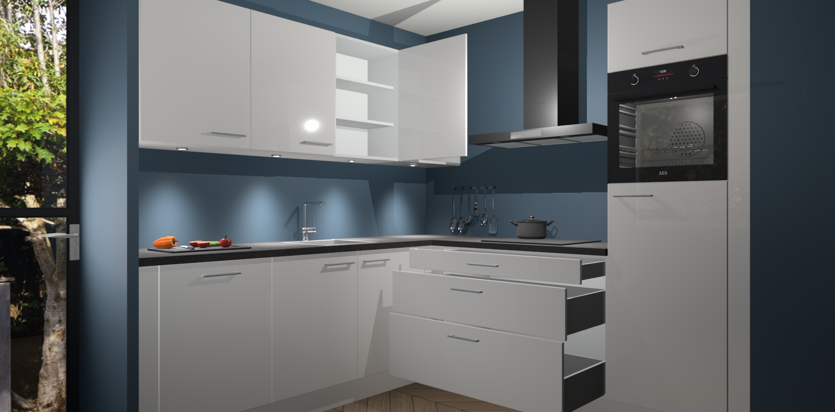 Met een modern, tijdloos design en ruime opslagruimte, zult u zich in no-time thuis voelen in uw nieuwe keuken. Uw leven wordt eenvoudiger met de soft-close deuren die voor het ultieme stille comfort zorgen - geen geluid dat u stoort terwijl u kookt. Ook is de keuken voorzien van 5 ingebouwde apparaten: een oven, inductie kookplaat, afzuigkap, vaatwasser en koelkast. Deze kunnen gemakkelijk na bestelling worden bijgewerkt naar AEG - waardoor uw luxe ervaring compleet is.