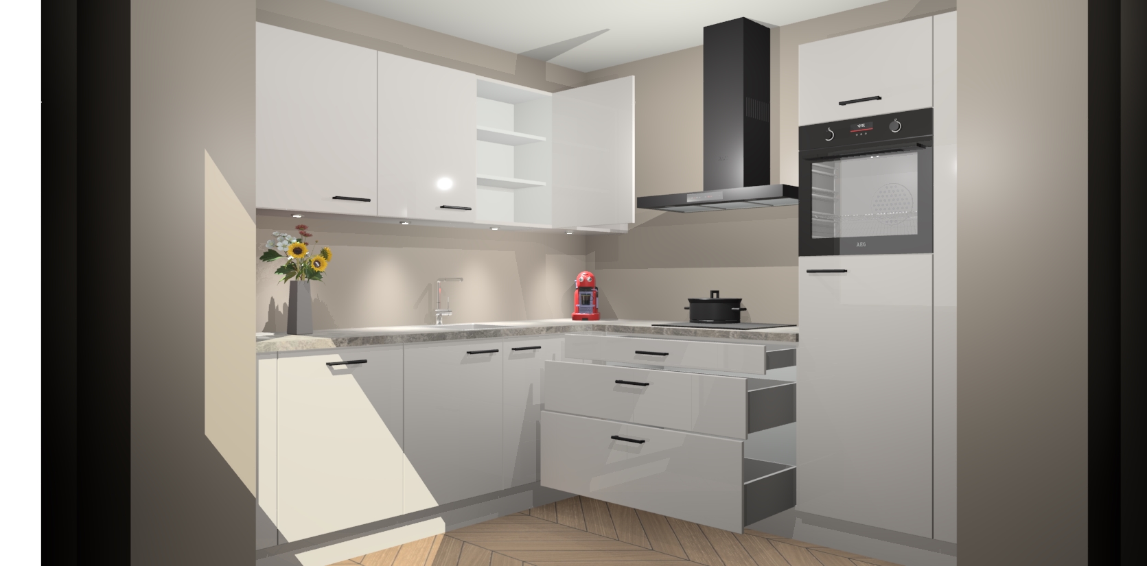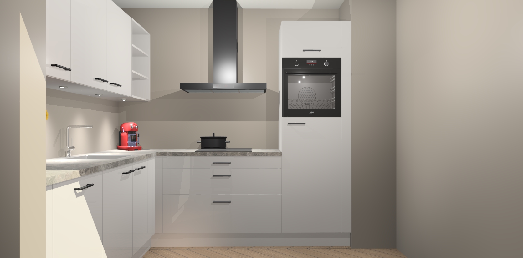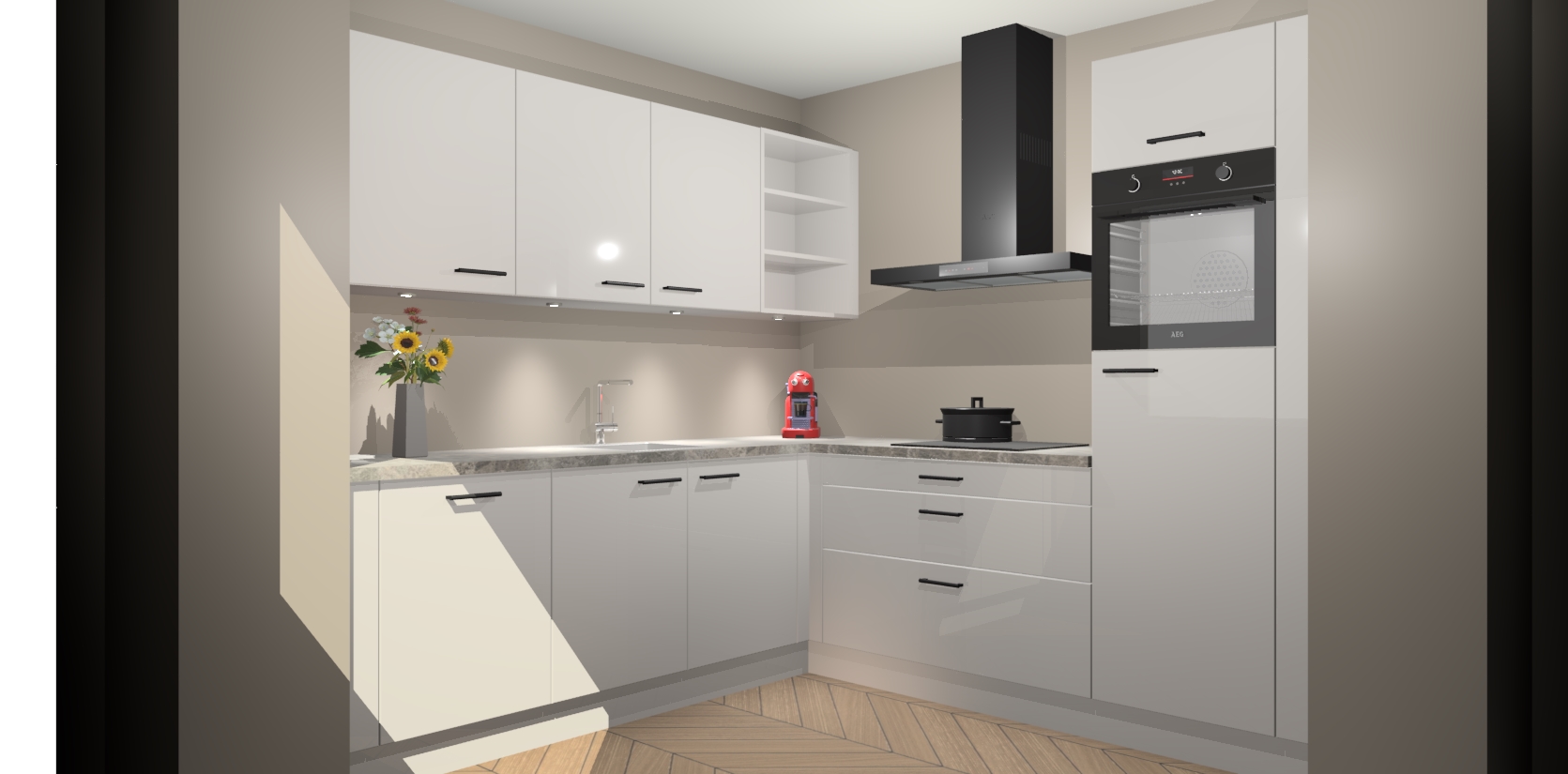 Met een modern, tijdloos design en ruime opslagruimte, zult u zich in no-time thuis voelen in uw nieuwe keuken. Uw leven wordt eenvoudiger met de soft-close deuren die voor het ultieme stille comfort zorgen - geen geluid dat u stoort terwijl u kookt. Ook is de keuken voorzien van 5 ingebouwde apparaten: een oven, inductie kookplaat, afzuigkap, vaatwasser en koelkast. Deze kunnen gemakkelijk na bestelling worden bijgewerkt naar AEG - waardoor uw luxe ervaring compleet is.