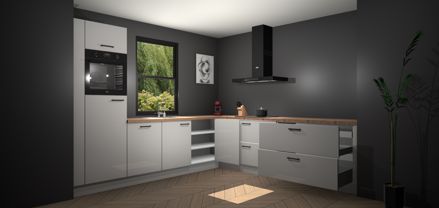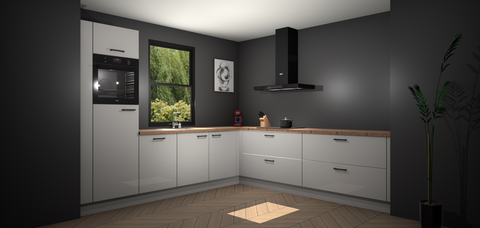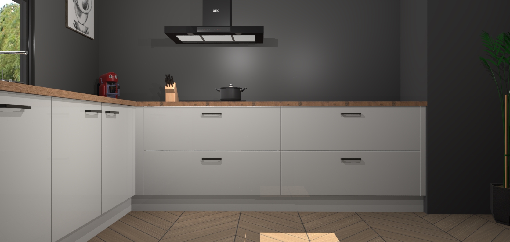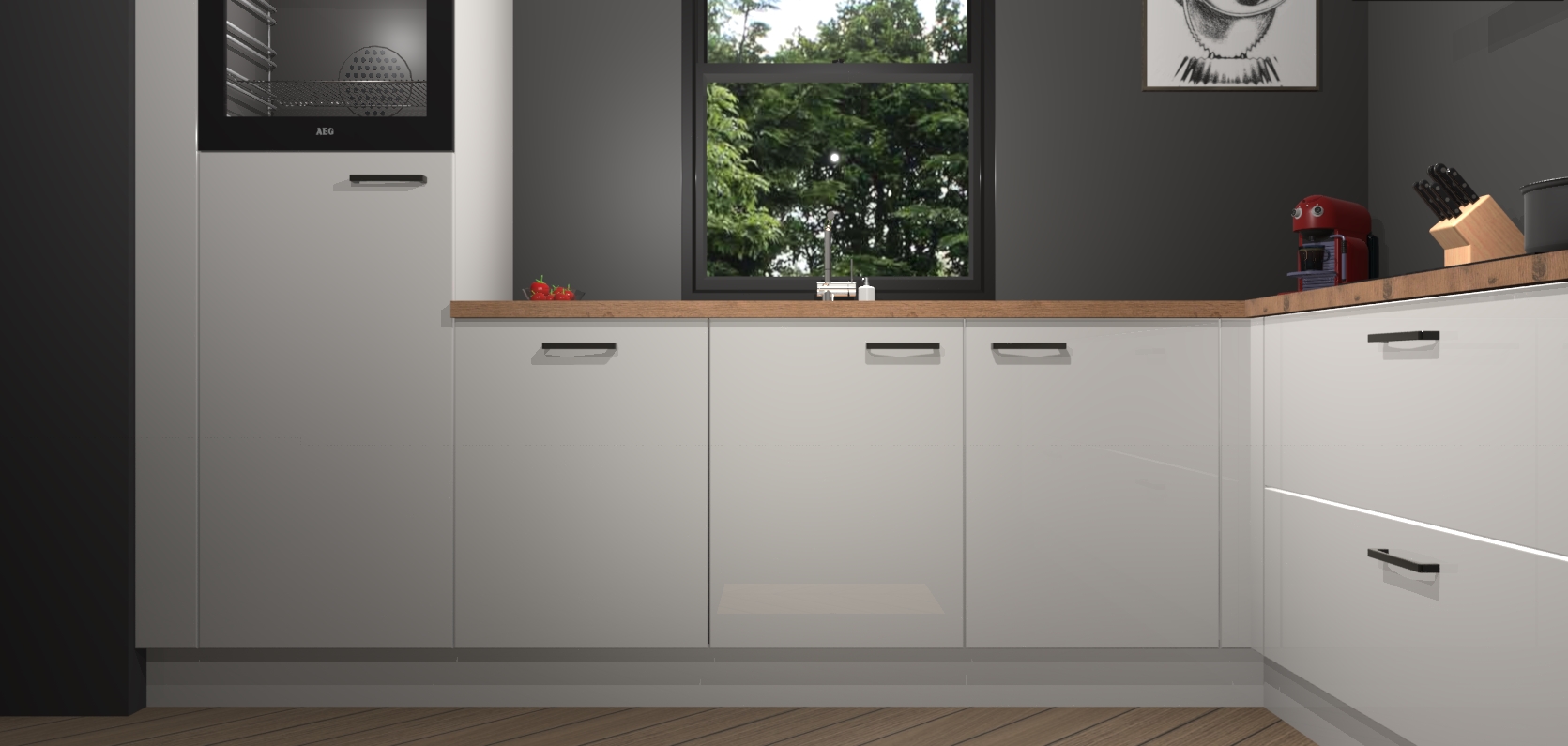 Welkom bij de zijdegrijze hoogglans keuken Lublin. Deze prachtige keuken zal de komende jaren het middelpunt van de belangstelling in uw huis zijn. Uitgerust met vijf inbouwapparaten komt u nooit kookgereedschap tekort. Bovendien geeft de warme houtlook elke ruimte een uitnodigende en tijdloze uitstraling.