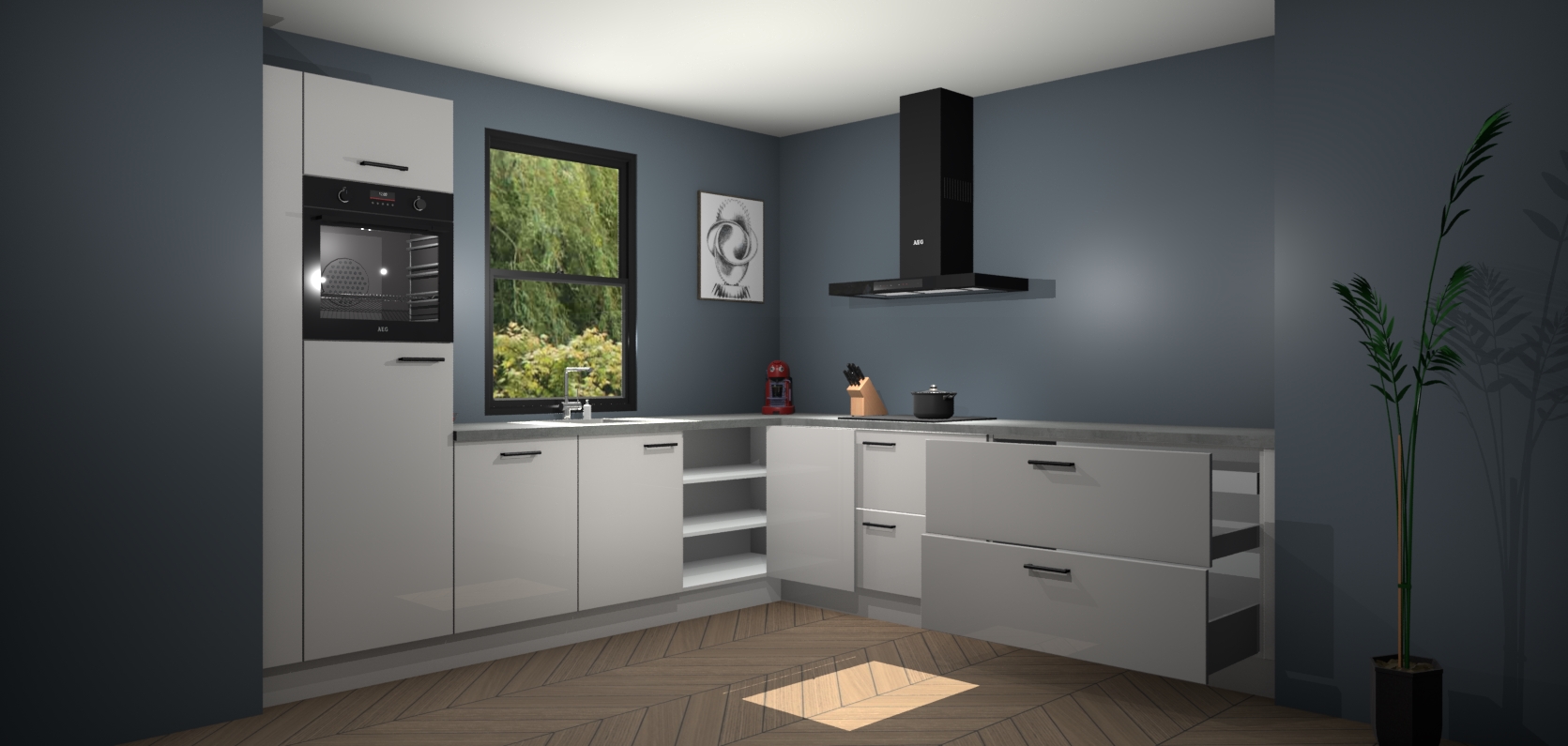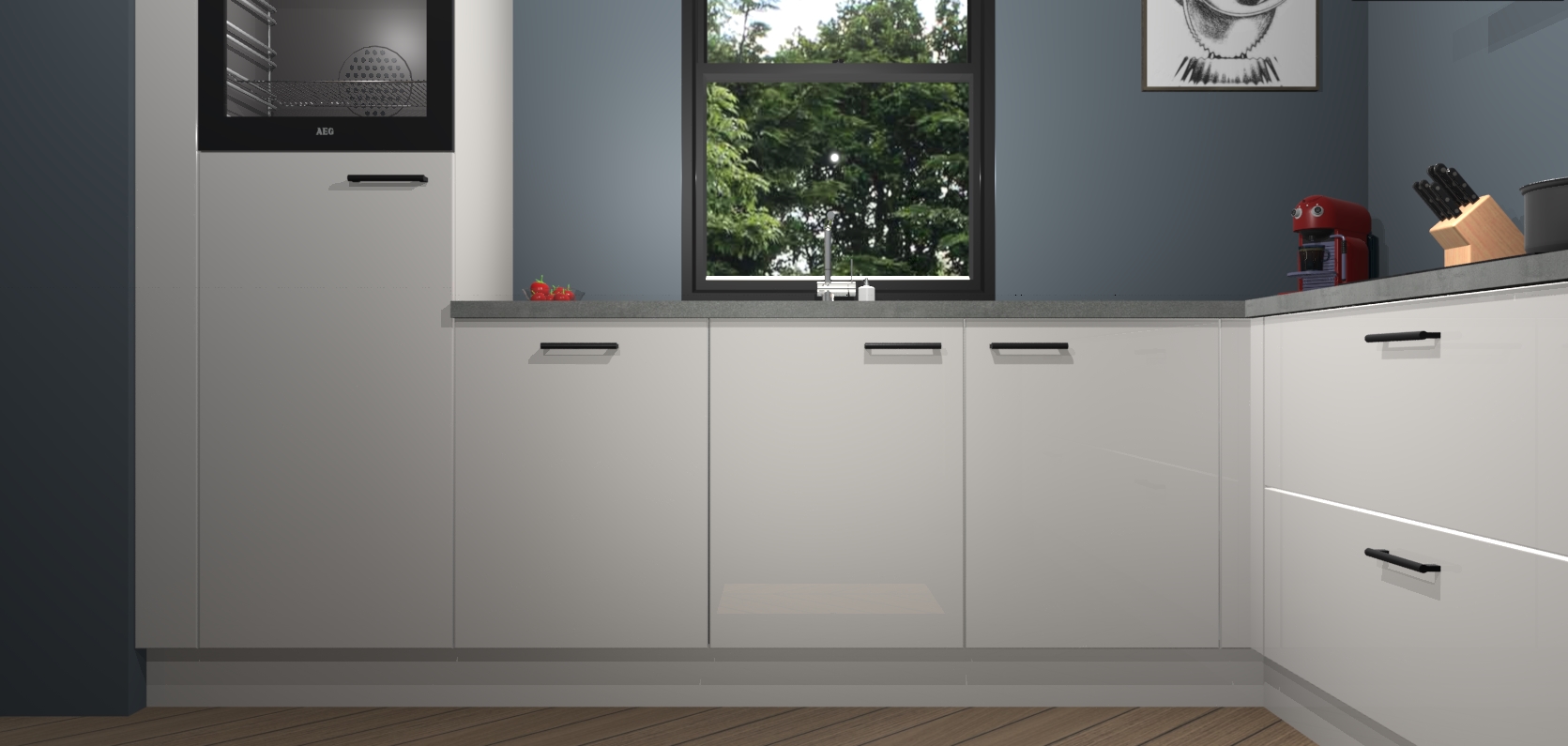 Welkom bij de zijdegrijze hoogglans keuken Lublin. Deze prachtige keuken zal de komende jaren het middelpunt van de belangstelling in uw huis zijn. Uitgerust met vijf inbouwapparaten komt u nooit kookgereedschap tekort. Bovendien geeft de warme houtlook elke ruimte een uitnodigende en tijdloze uitstraling.