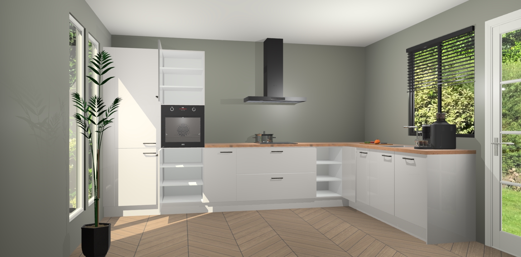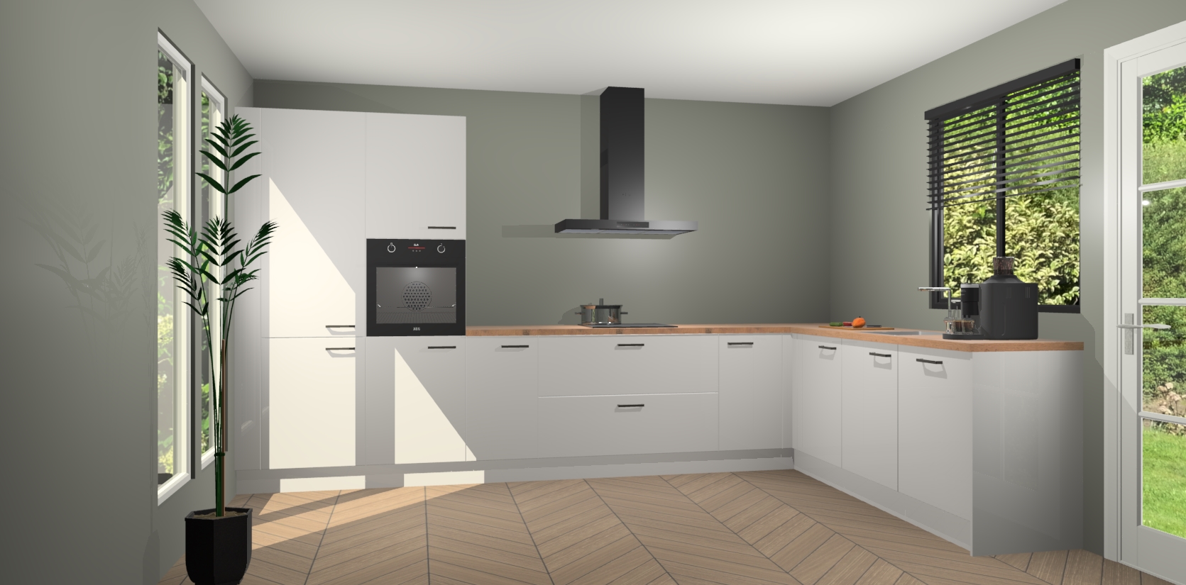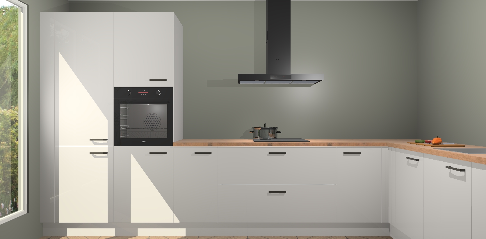 Met een modern, tijdloos design en ruime opslagruimte, zult u zich in no-time thuis voelen in uw nieuwe keuken. Uw leven wordt eenvoudiger met de soft-close deuren die voor het ultieme stille comfort zorgen - geen geluid dat u stoort terwijl u kookt. Ook is de keuken voorzien van 5 ingebouwde apparaten: een oven, inductie kookplaat, afzuigkap, vaatwasser en koelkast. Deze kunnen gemakkelijk na bestelling worden bijgewerkt naar AEG - waardoor uw luxe ervaring compleet is.