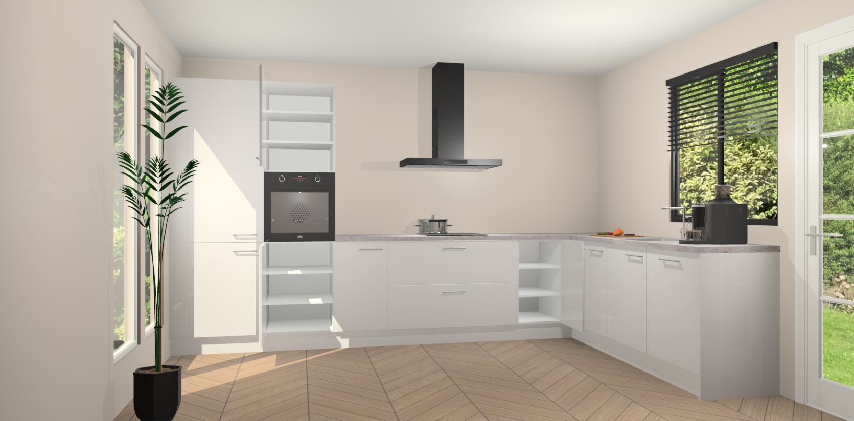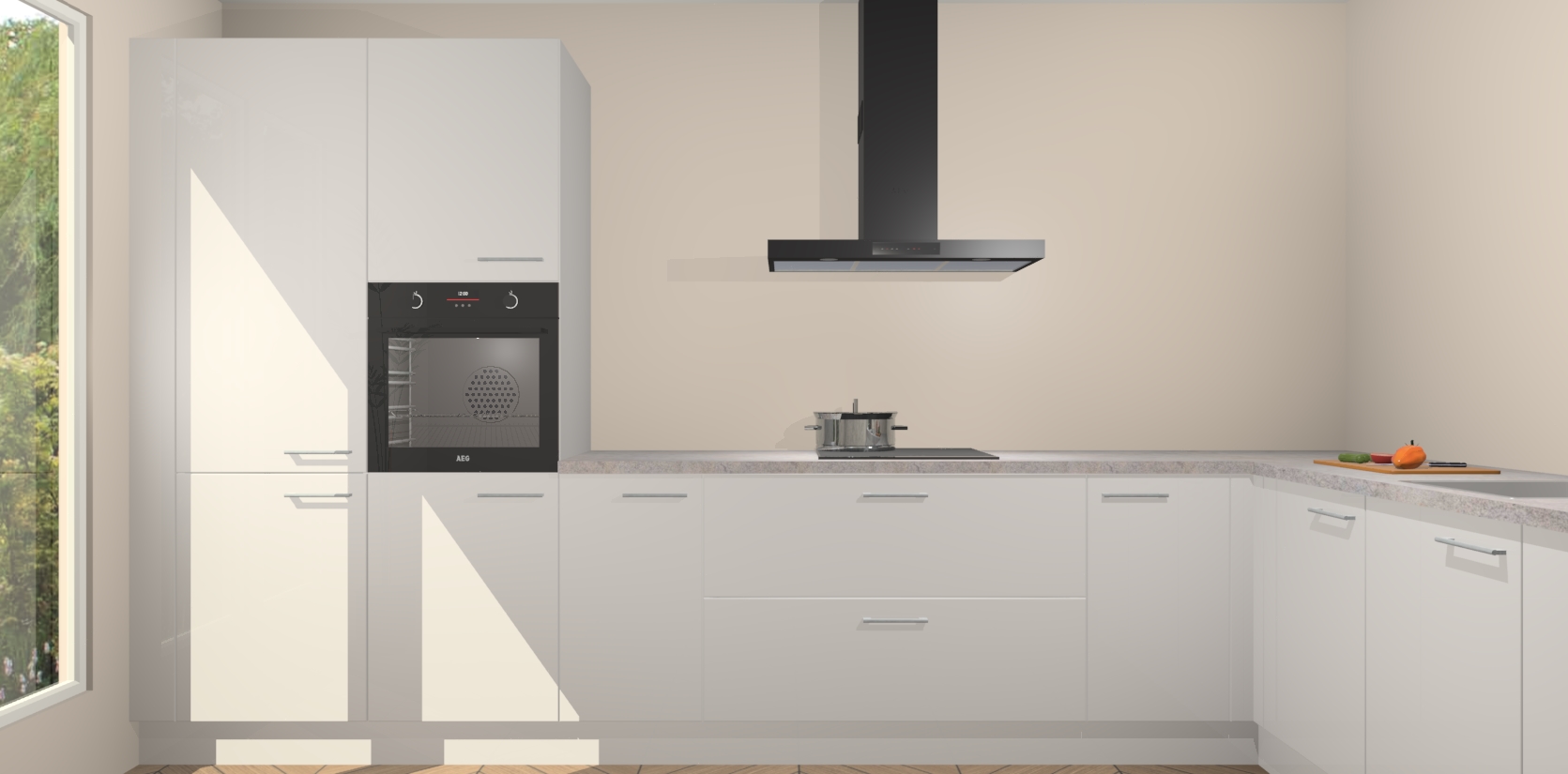 Met een modern, tijdloos design en ruime opslagruimte, zult u zich in no-time thuis voelen in uw nieuwe keuken. Uw leven wordt eenvoudiger met de soft-close deuren die voor het ultieme stille comfort zorgen - geen geluid dat u stoort terwijl u kookt. Ook is de keuken voorzien van 5 ingebouwde apparaten: een oven, inductie kookplaat, afzuigkap, vaatwasser en koelkast. Deze kunnen gemakkelijk na bestelling worden bijgewerkt naar AEG - waardoor uw luxe ervaring compleet is.