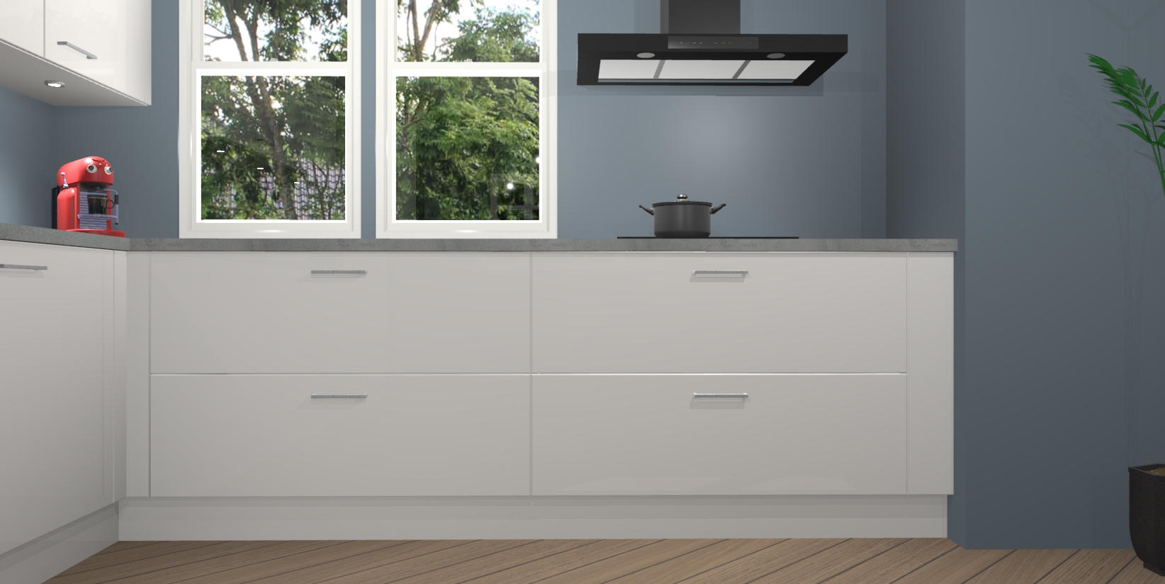 Zijdegrijze hoogglans keuken Opole zal u de adem benemen met zijn moderne en strakke look!