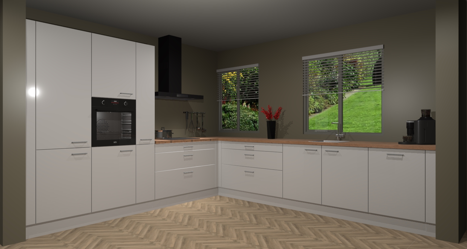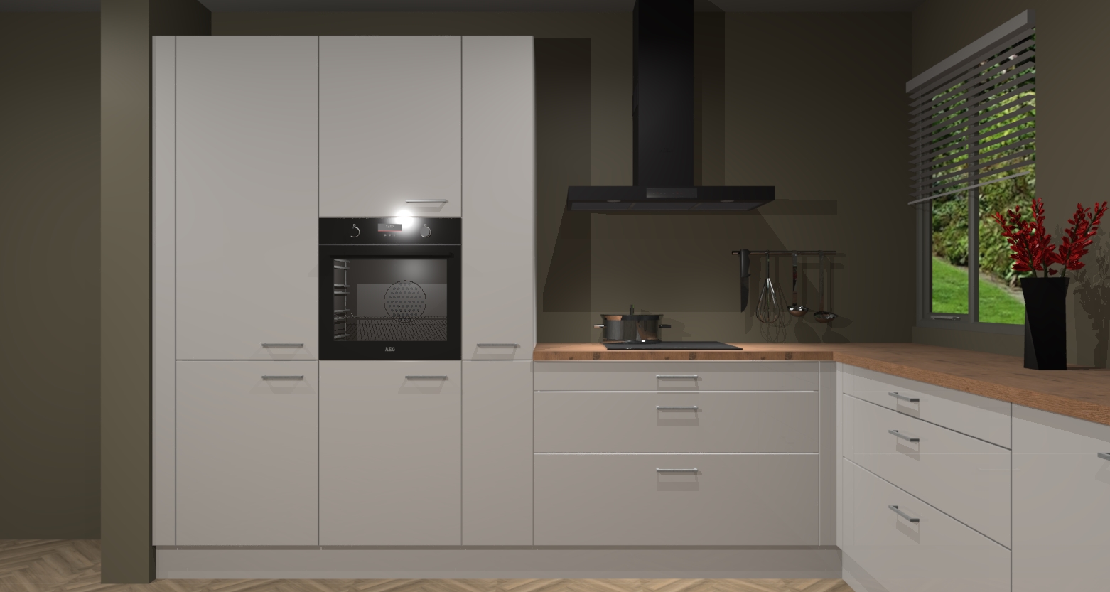 Welkom bij de Zijdegrijze hoogglans keuken Palermo. Deze prachtige keuken zal de komende jaren het middelpunt van de belangstelling in uw huis zijn. Uitgerust met vijf inbouwapparaten komt u nooit kookgereedschap tekort. Bovendien geeft de warme houtlook elke ruimte een uitnodigende en tijdloze uitstraling.