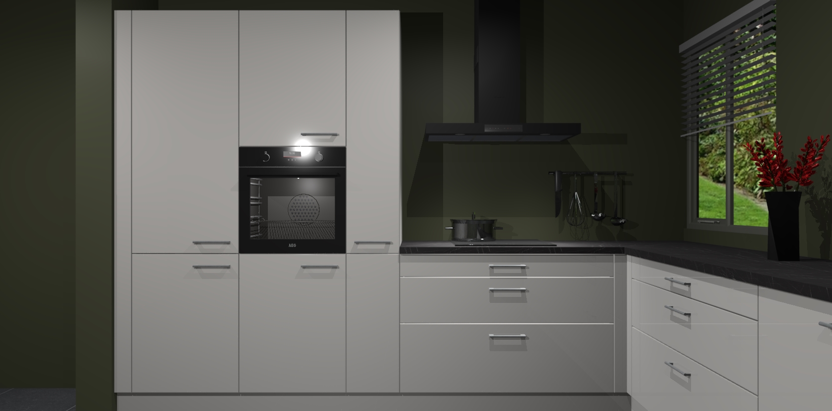 Welkom bij de Zijdegrijze hoogglans keuken Palermo. Deze prachtige keuken zal de komende jaren het middelpunt van de belangstelling in uw huis zijn. Uitgerust met vijf inbouwapparaten komt u nooit kookgereedschap tekort. Bovendien geeft de warme houtlook elke ruimte een uitnodigende en tijdloze uitstraling.