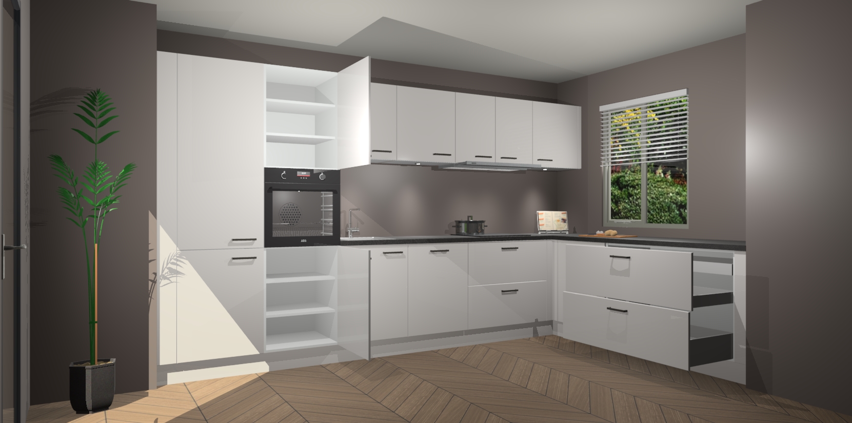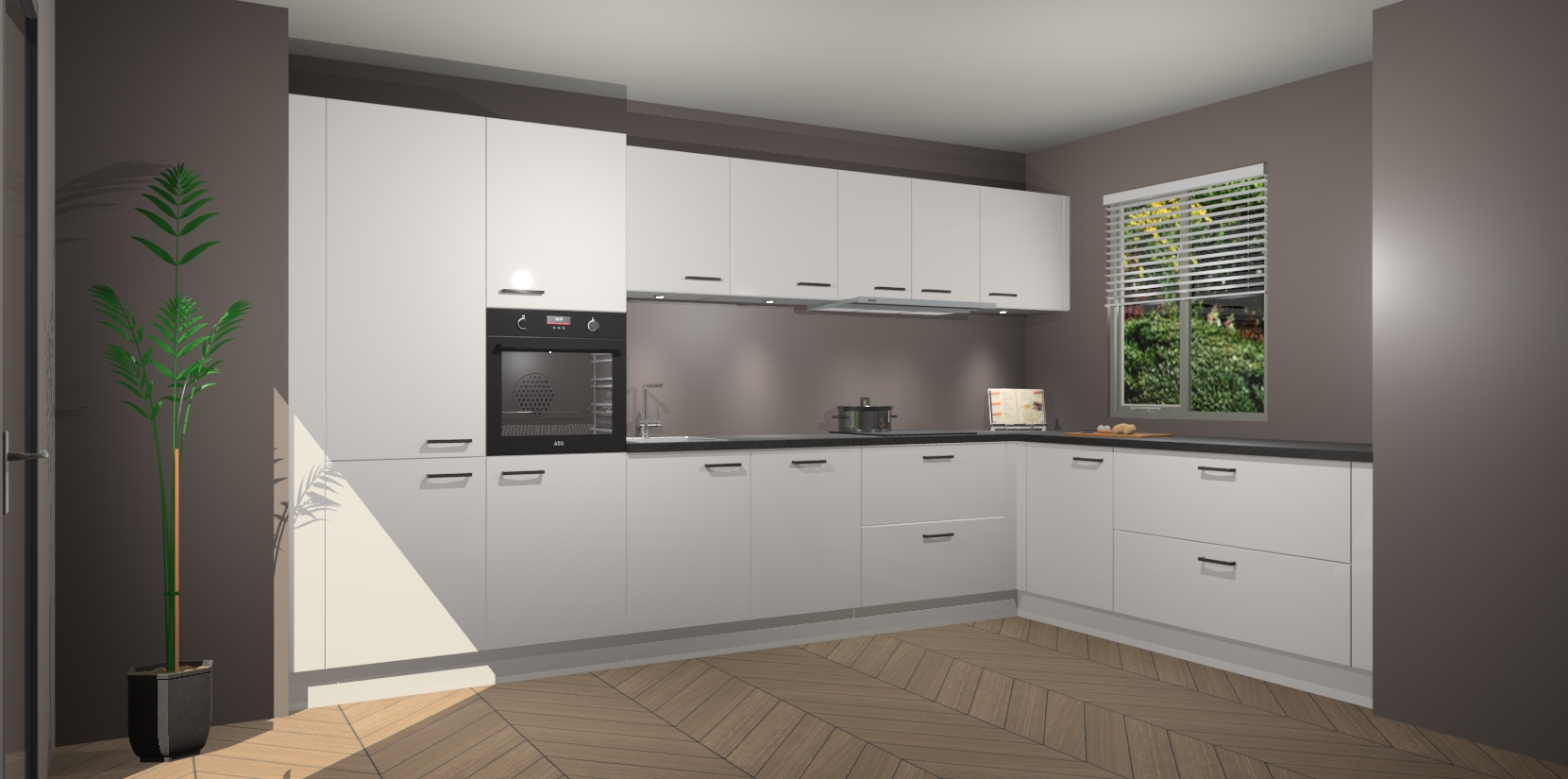 Verwelkom de natuurlijke warmte van de Zijdegrijze Hoogglans keuken Petten in uw huis. Deze prachtige hoekkeuken met zijn moderne design en warme houten look geeft u meer dan genoeg opbergruimte om uw comfortabel te voelen in uw keuken. Geniet van soft-close deuren die al uw gasten het gevoel zullen geven dat ze zich in een luxueuze ruimte bevinden.