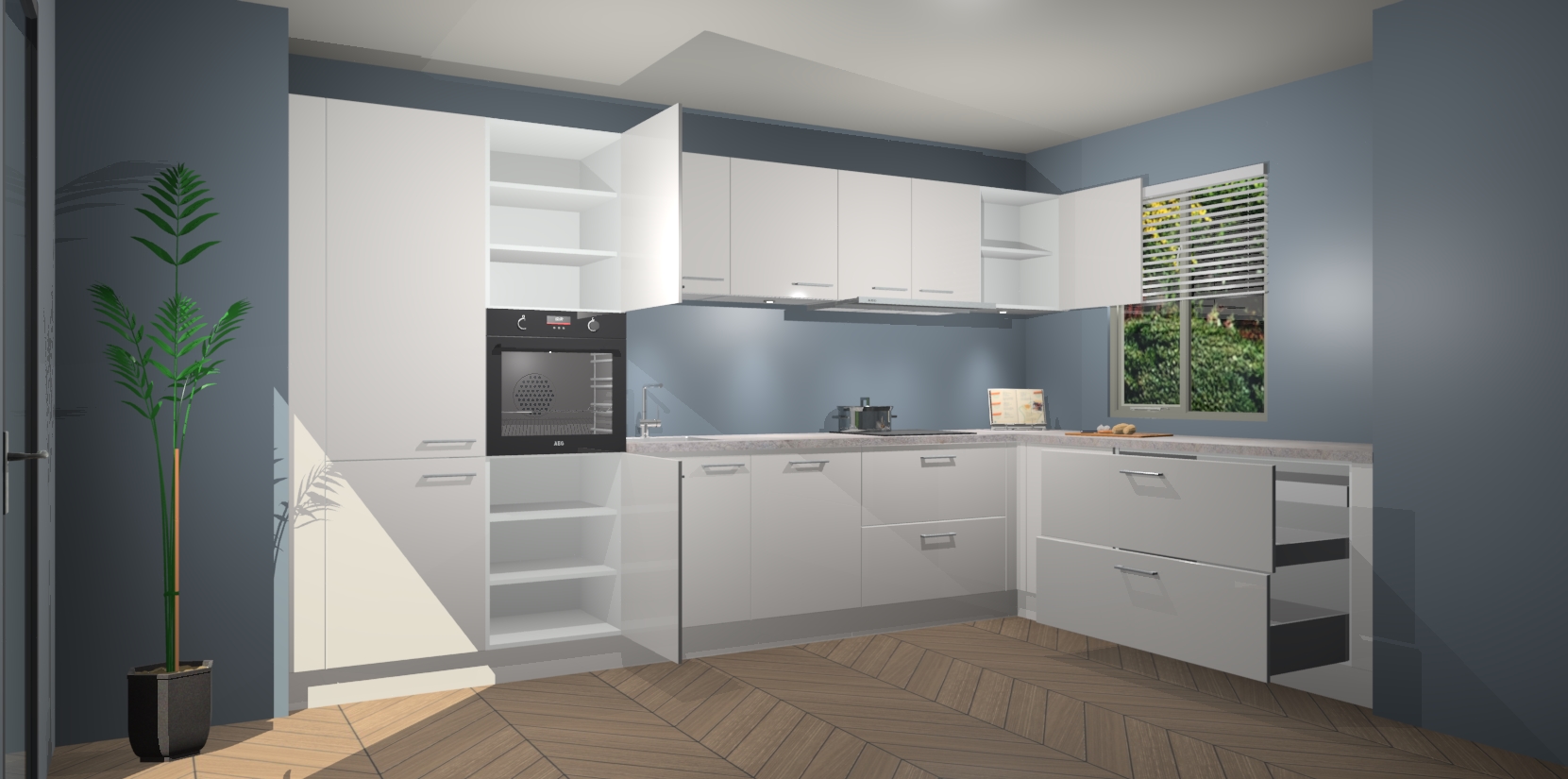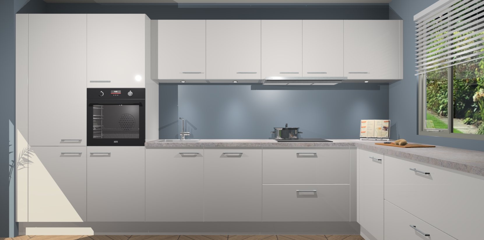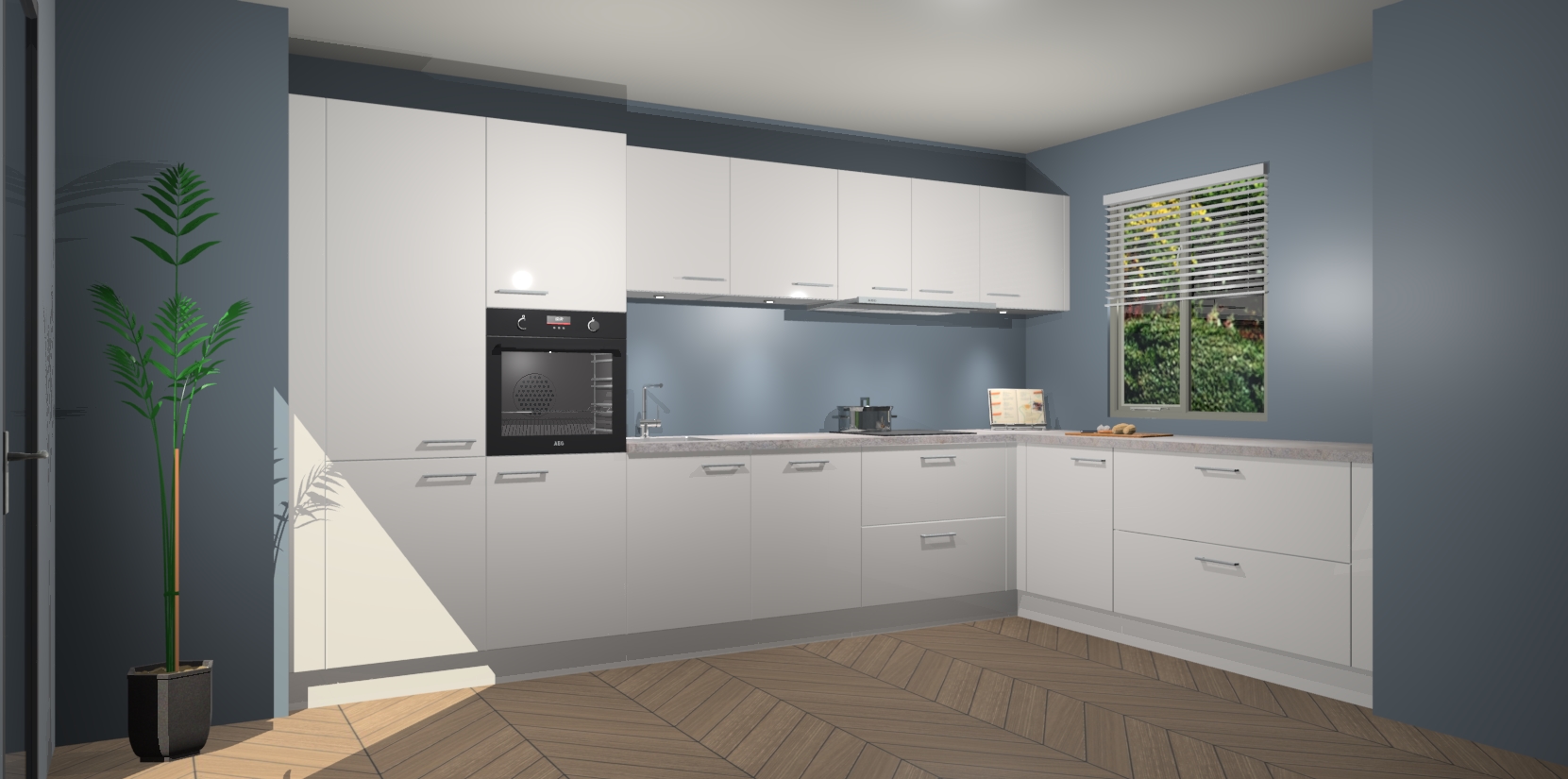 Verwelkom de natuurlijke warmte van de Zijdegrijze Hoogglans keuken Petten in uw huis. Deze prachtige hoekkeuken met zijn moderne design en warme houten look geeft u meer dan genoeg opbergruimte om uw comfortabel te voelen in uw keuken. Geniet van soft-close deuren die al uw gasten het gevoel zullen geven dat ze zich in een luxueuze ruimte bevinden.