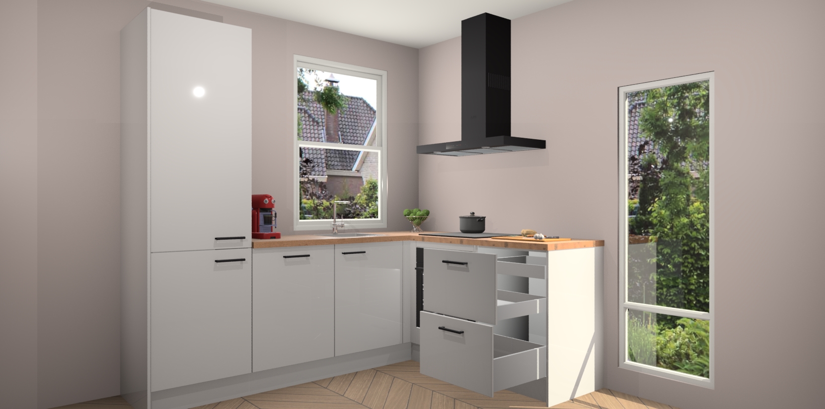 De prachtige Zijdegrijze hoogglans keuken Phuket is de perfecte keuze als u op zoek bent naar een moderne hoekkeuken met alle luxe en comfort die u kunt verwachten! De uitstraling in het houtlook-design draagt bij aan de warme sfeer die u nu al voelt wanneer u er naar kijkt. Heeft u genoeg van ouderwetse keukens? Probeer dan direct deze moderne, mooie hoekkeukens en laat iedereen verbluft achter!