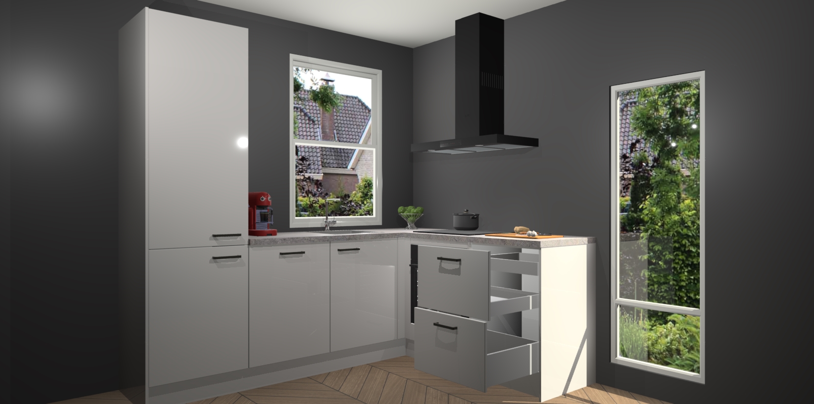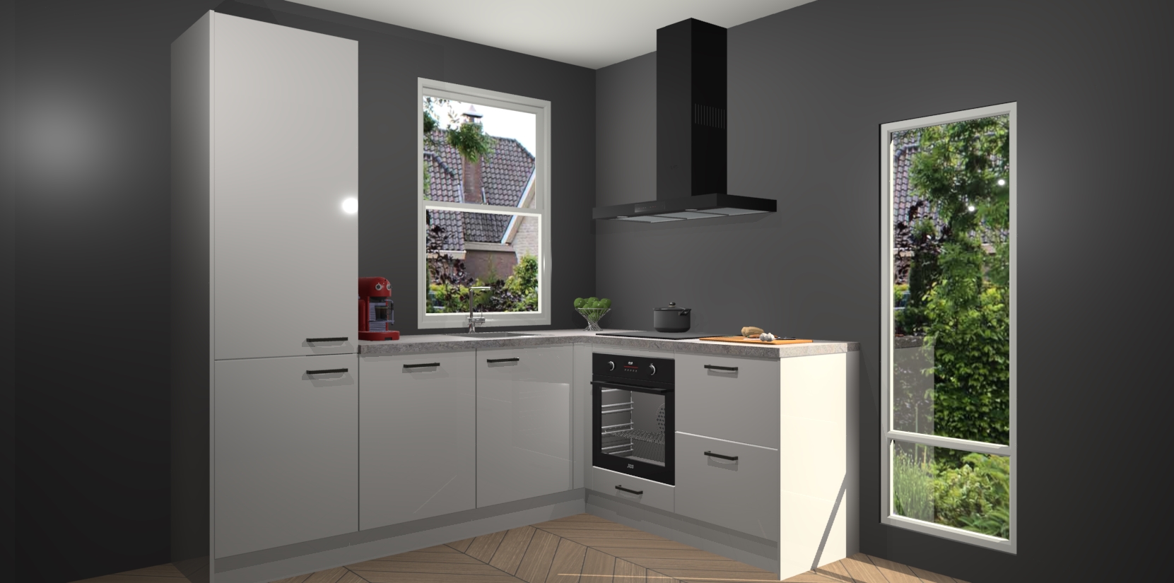 De prachtige Zijdegrijze hoogglans keuken Phuket is de perfecte keuze als u op zoek bent naar een moderne hoekkeuken met alle luxe en comfort die u kunt verwachten! De uitstraling in het houtlook-design draagt bij aan de warme sfeer die u nu al voelt wanneer u er naar kijkt. Heeft u genoeg van ouderwetse keukens? Probeer dan direct deze moderne, mooie hoekkeukens en laat iedereen verbluft achter!
