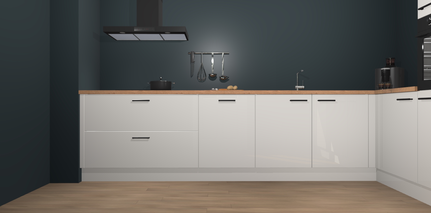 Welkom bij de Zijdegrijze hoogglans keuken Portland. Deze prachtige keuken zal de komende jaren het middelpunt van de belangstelling in uw huis zijn. Uitgerust met vijf inbouwapparaten komt u nooit kookgereedschap tekort. Bovendien geeft de warme houtlook elke ruimte een uitnodigende en tijdloze uitstraling.