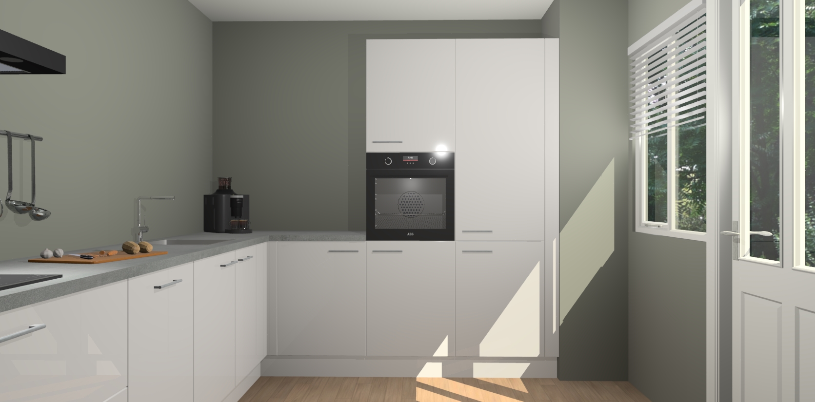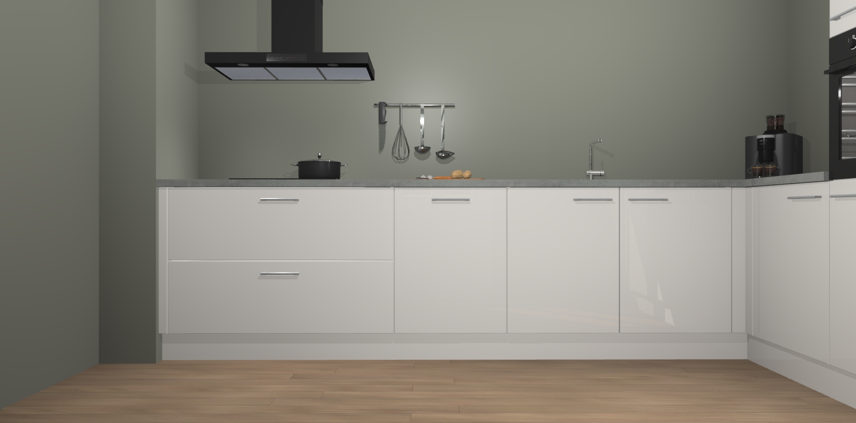 Welkom bij de Zijdegrijze hoogglans keuken Portland. Deze prachtige keuken zal de komende jaren het middelpunt van de belangstelling in uw huis zijn. Uitgerust met vijf inbouwapparaten komt u nooit kookgereedschap tekort. Bovendien geeft de warme houtlook elke ruimte een uitnodigende en tijdloze uitstraling.