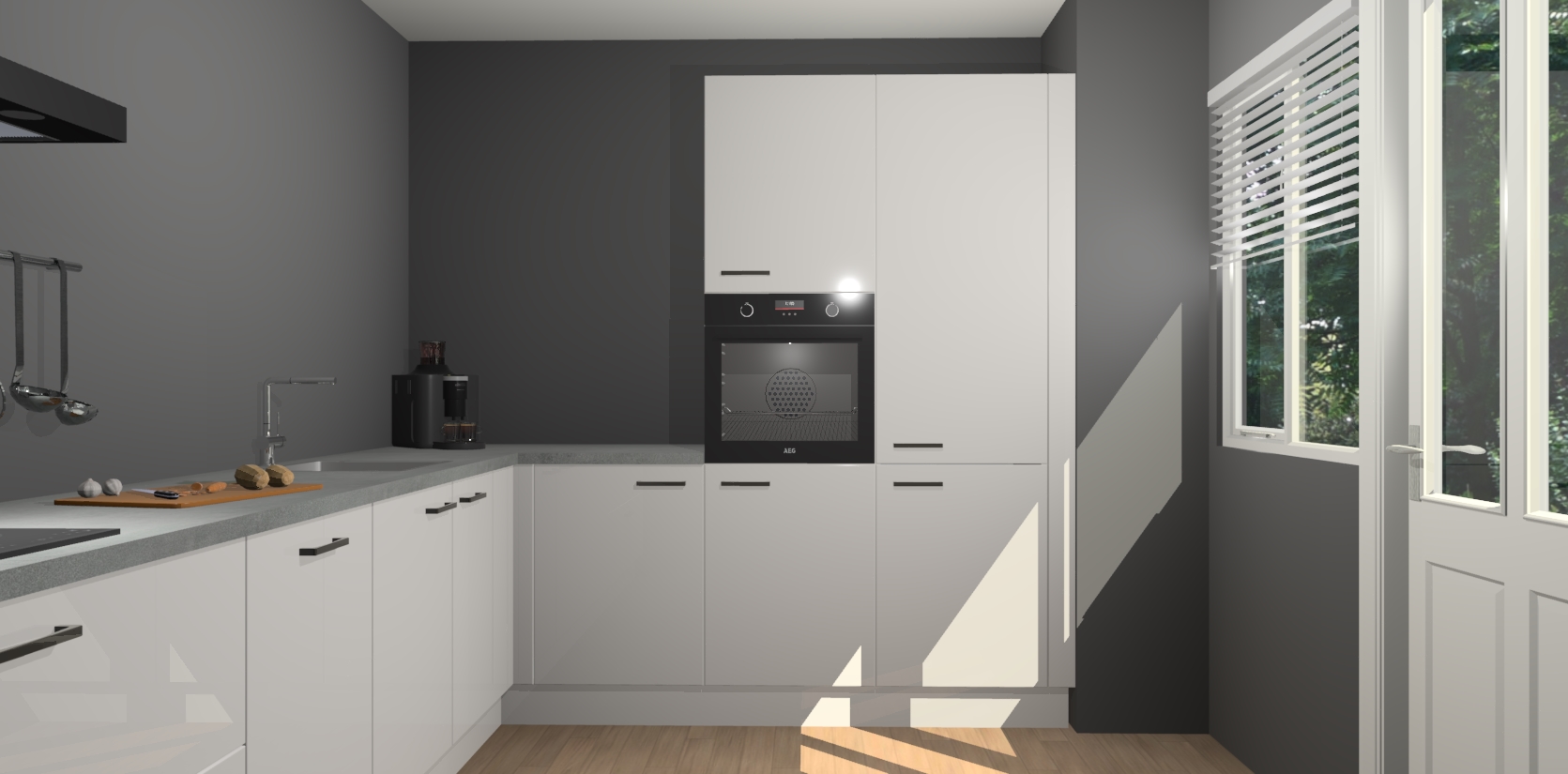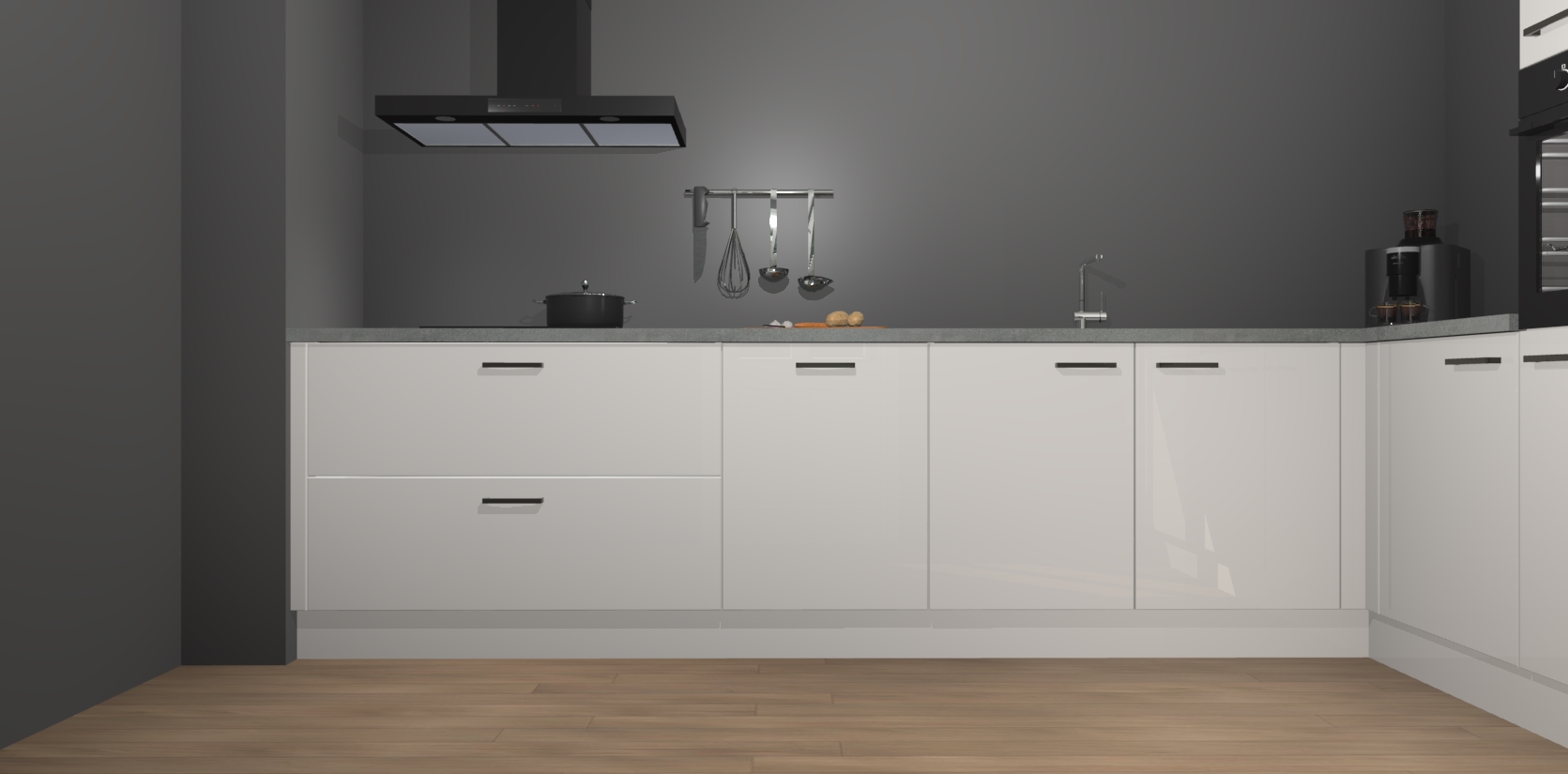 Welkom bij de Zijdegrijze hoogglans keuken Portland. Deze prachtige keuken zal de komende jaren het middelpunt van de belangstelling in uw huis zijn. Uitgerust met vijf inbouwapparaten komt u nooit kookgereedschap tekort. Bovendien geeft de warme houtlook elke ruimte een uitnodigende en tijdloze uitstraling.