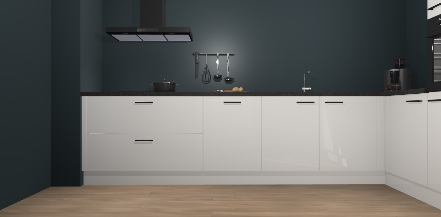 Welkom bij de Zijdegrijze hoogglans keuken Portland. Deze prachtige keuken zal de komende jaren het middelpunt van de belangstelling in uw huis zijn. Uitgerust met vijf inbouwapparaten komt u nooit kookgereedschap tekort. Bovendien geeft de warme houtlook elke ruimte een uitnodigende en tijdloze uitstraling.