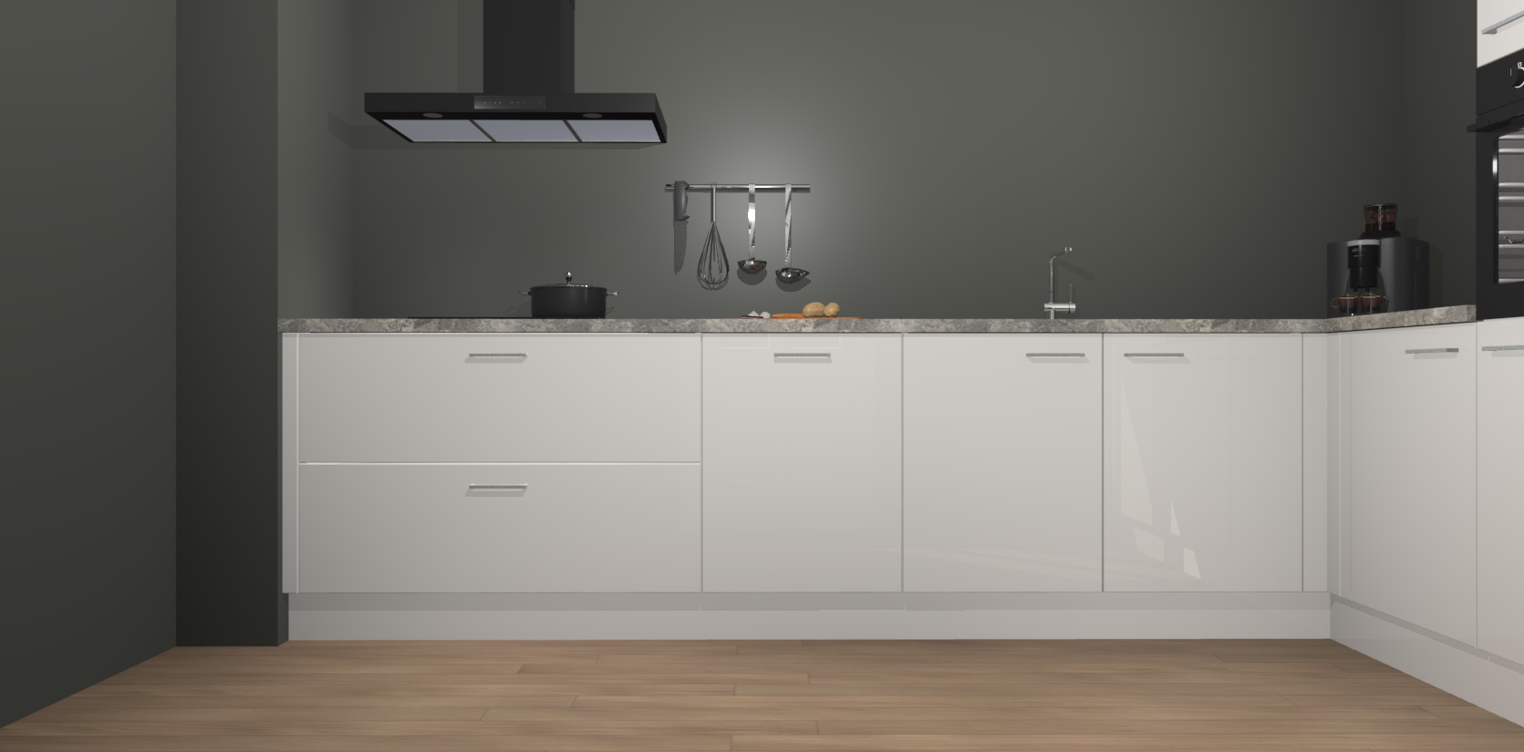 Welkom bij de Zijdegrijze hoogglans keuken Portland. Deze prachtige keuken zal de komende jaren het middelpunt van de belangstelling in uw huis zijn. Uitgerust met vijf inbouwapparaten komt u nooit kookgereedschap tekort. Bovendien geeft de warme houtlook elke ruimte een uitnodigende en tijdloze uitstraling.