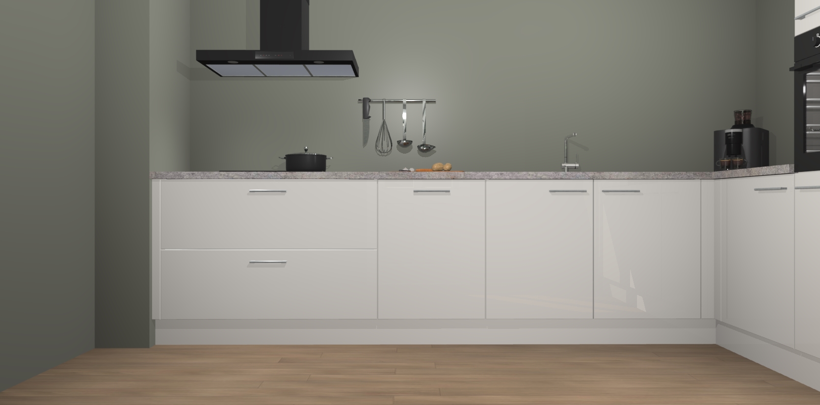 Welkom bij de Zijdegrijze hoogglans keuken Portland. Deze prachtige keuken zal de komende jaren het middelpunt van de belangstelling in uw huis zijn. Uitgerust met vijf inbouwapparaten komt u nooit kookgereedschap tekort. Bovendien geeft de warme houtlook elke ruimte een uitnodigende en tijdloze uitstraling.
