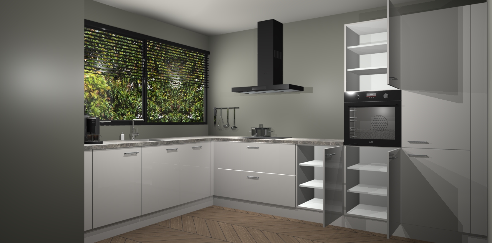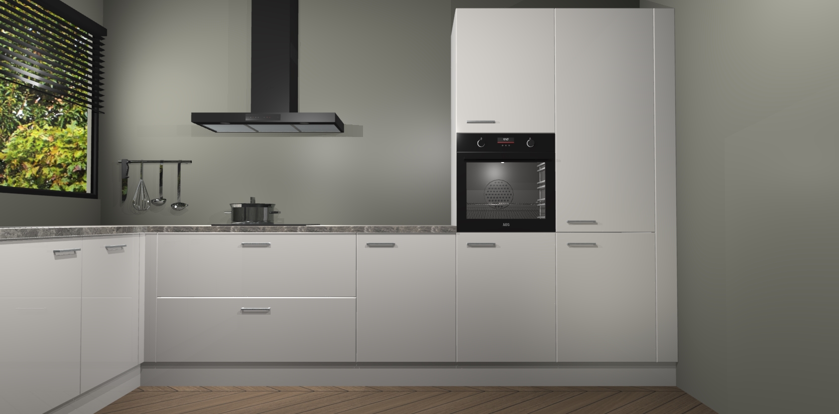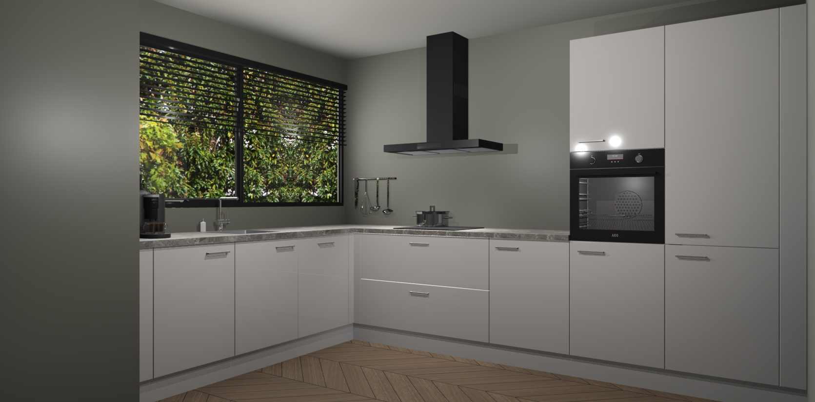 Met een modern, tijdloos design en ruime opslagruimte, zult u zich in no-time thuis voelen in uw nieuwe keuken. Uw leven wordt eenvoudiger met de soft-close deuren die voor het ultieme stille comfort zorgen - geen geluid dat u stoort terwijl u kookt. Ook is de keuken voorzien van 5 ingebouwde apparaten: een oven, inductie kookplaat, afzuigkap, vaatwasser en koelkast. Deze kunnen gemakkelijk na bestelling worden bijgewerkt naar AEG - waardoor uw luxe ervaring compleet is.