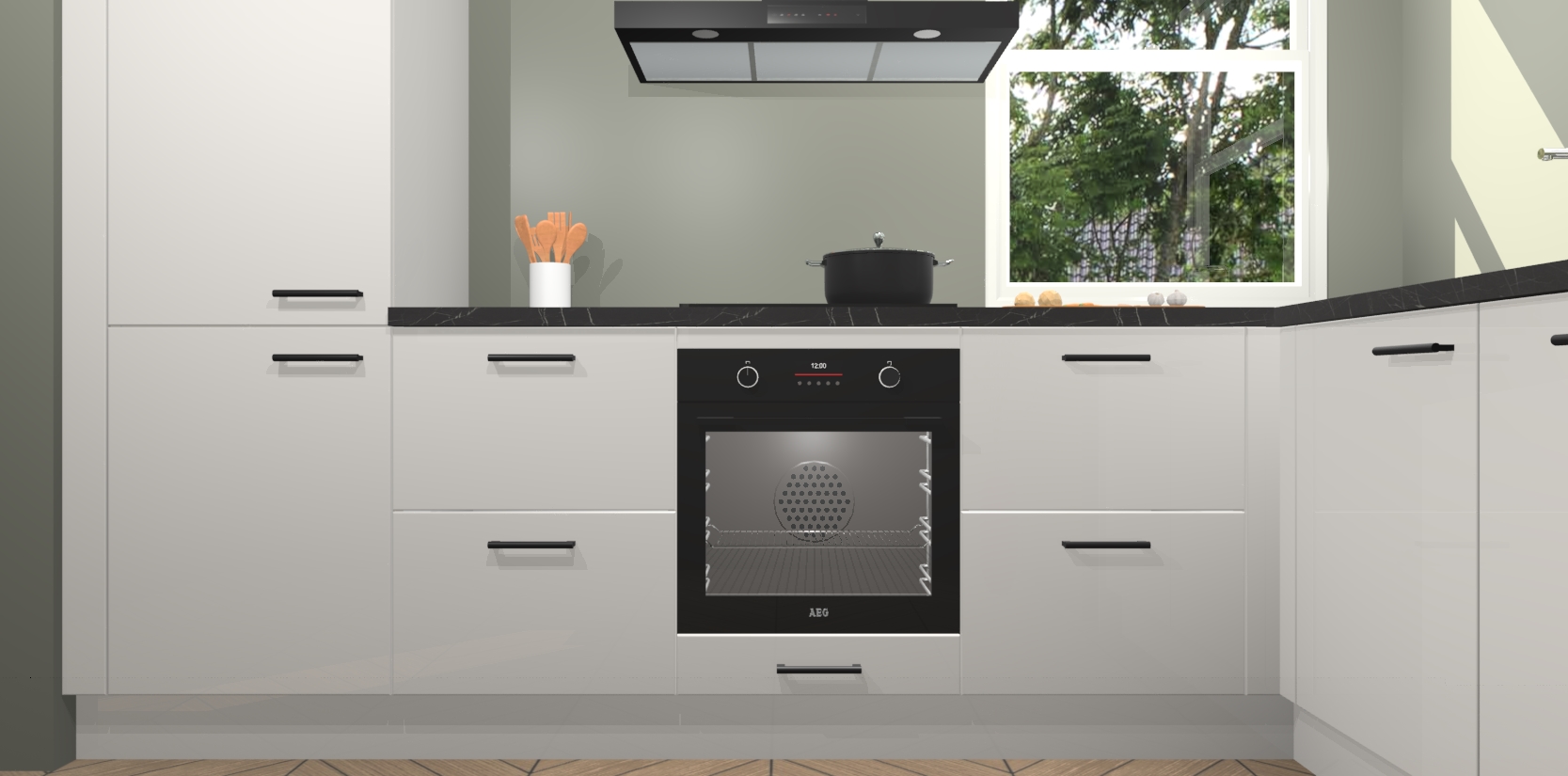 Wat maakt deze keuken zo bijzonder? Ten eerste geeft het houten werkblad uw ruimte een onmiskenbaar klassieke uitstraling. De natuurlijke afwerking roept warmte en elegantie op die nooit uit de mode zullen raken. Bovendien is het gemakkelijk schoon te houden en te onderhouden, zodat je er jarenlang plezier van kunt hebben. Als u op zoek bent naar extra gemak in uw keuken, dan heeft u bij het plaatsen van een bestelling bij ons ook de optie om uw toestellen te upgraden naar AEG-modellen - zo haalt u moderne innovatie van topmerken in apparatentechnologie rechtstreeks in huis.