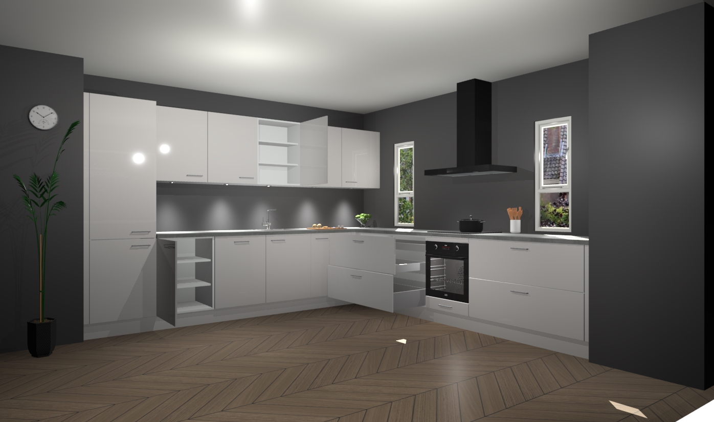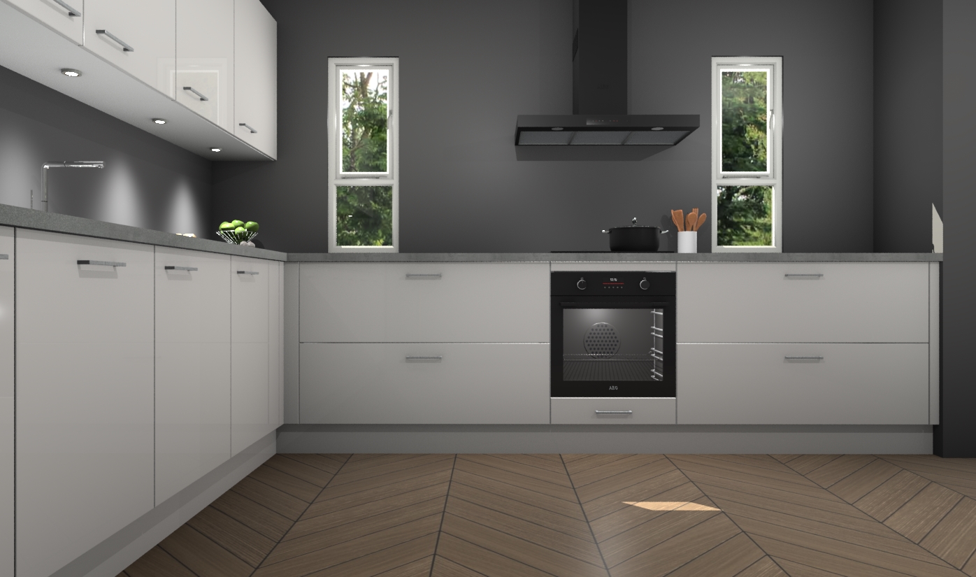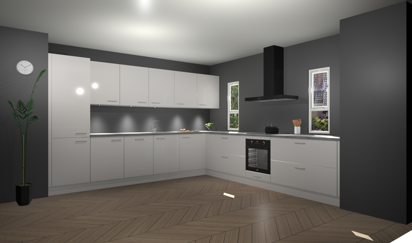 De zijdegrijze hoogglans keuken is een ideale hoekkeuken en heeft alle functies en apparatuur die u maar nodig kunt hebben. Bij de bestelling krijgt u een oven, inductiekookplaat, afzuigkap, vaatwasser en koelkast - deze kunnen desgewenst eenvoudig worden uitgebreid naar AEG na bestellen. Elke kast wordt ook voor gemonteerd geleverd met soft close deuren die jarenlang gebruik beloven. Stelt u zich voor dat u geen gedoe heeft met vervelende montage - vanaf het moment dat u uw bestelling plaats, duurt het slechts 7 weken voor het bij u thuis geleverd wordt.