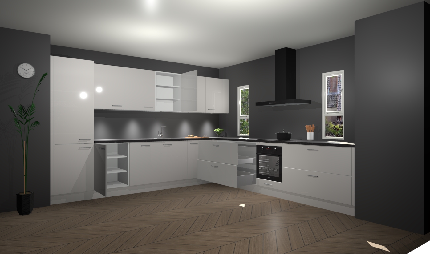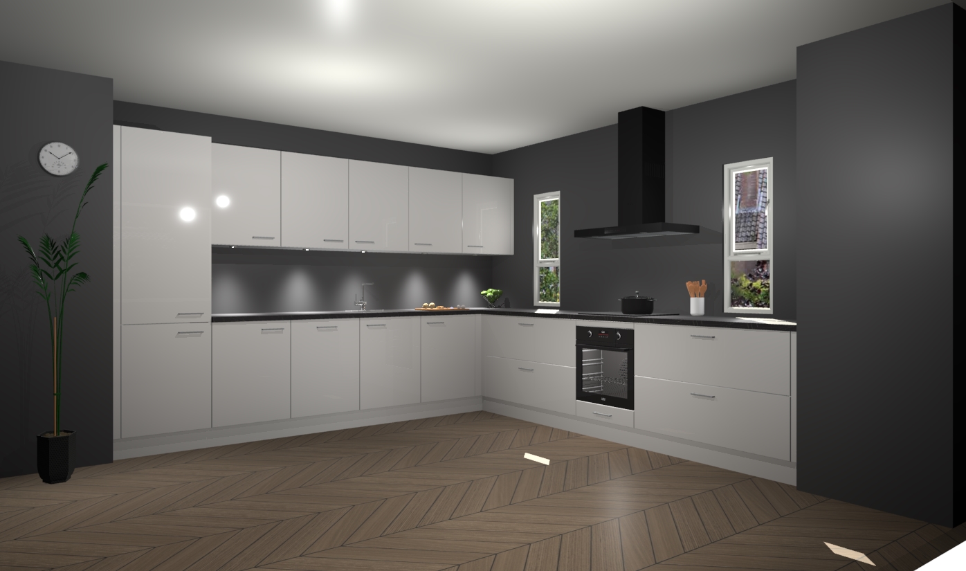 De zijdegrijze hoogglans keuken is een ideale hoekkeuken en heeft alle functies en apparatuur die u maar nodig kunt hebben. Bij de bestelling krijgt u een oven, inductiekookplaat, afzuigkap, vaatwasser en koelkast - deze kunnen desgewenst eenvoudig worden uitgebreid naar AEG na bestellen. Elke kast wordt ook voor gemonteerd geleverd met soft close deuren die jarenlang gebruik beloven. Stelt u zich voor dat u geen gedoe heeft met vervelende montage - vanaf het moment dat u uw bestelling plaats, duurt het slechts 7 weken voor het bij u thuis geleverd wordt.