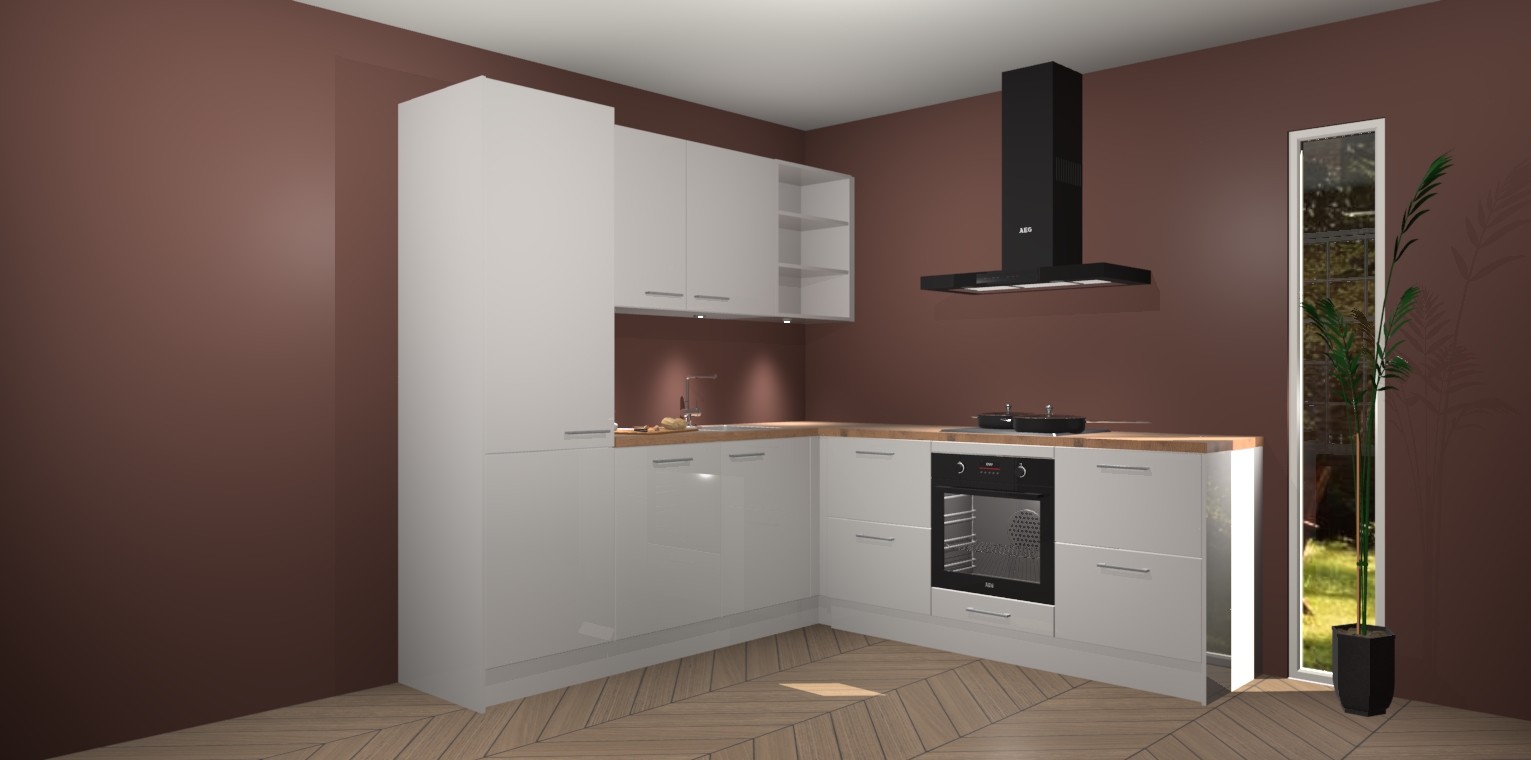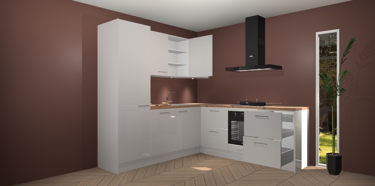Met zijn moderne design en aantrekkelijke hoekopstelling biedt deze keuken een unieke look die zelfs de meest veeleisende huiseigenaar zal bevallen. En omdat de binnenkant van de kasten dezelfde kleur heeft als de buitenkant, heeft uw keuken een consistente afwerking. Bovenop de geweldige look is opbergruimte ook geen probleem, met voldoende kast- en laderuimte achter zelfs de mooiste buitenkant.