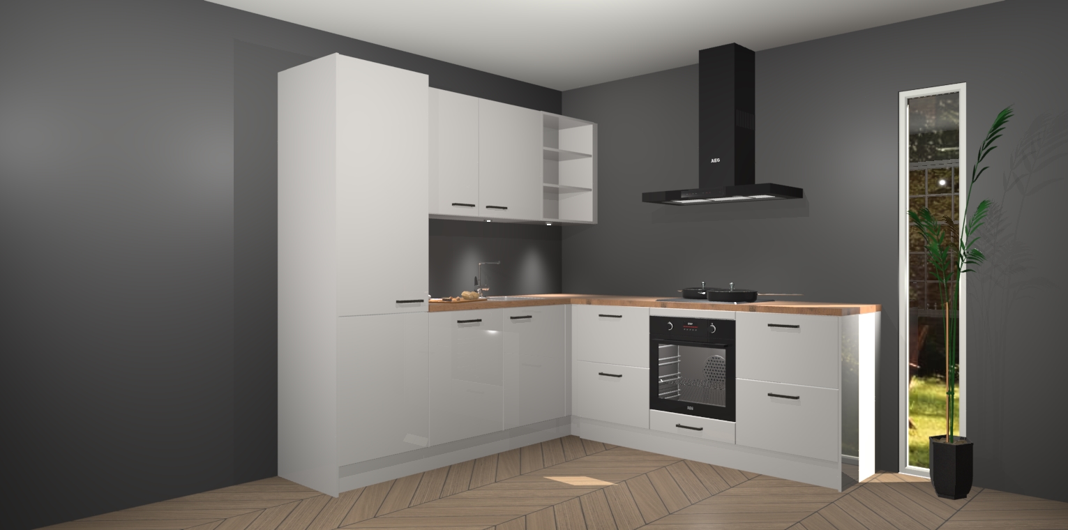 Met zijn moderne design en aantrekkelijke hoekopstelling biedt deze keuken een unieke look die zelfs de meest veeleisende huiseigenaar zal bevallen. En omdat de binnenkant van de kasten dezelfde kleur heeft als de buitenkant, heeft uw keuken een consistente afwerking. Bovenop de geweldige look is opbergruimte ook geen probleem, met voldoende kast- en laderuimte achter zelfs de mooiste buitenkant.