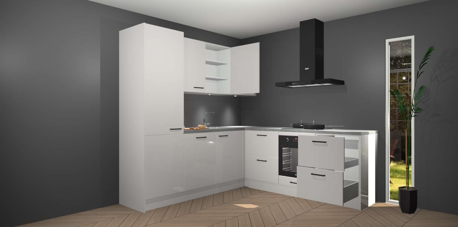 Met zijn moderne design en aantrekkelijke hoekopstelling biedt deze keuken een unieke look die zelfs de meest veeleisende huiseigenaar zal bevallen. En omdat de binnenkant van de kasten dezelfde kleur heeft als de buitenkant, heeft uw keuken een consistente afwerking. Bovenop de geweldige look is opbergruimte ook geen probleem, met voldoende kast- en laderuimte achter zelfs de mooiste buitenkant.