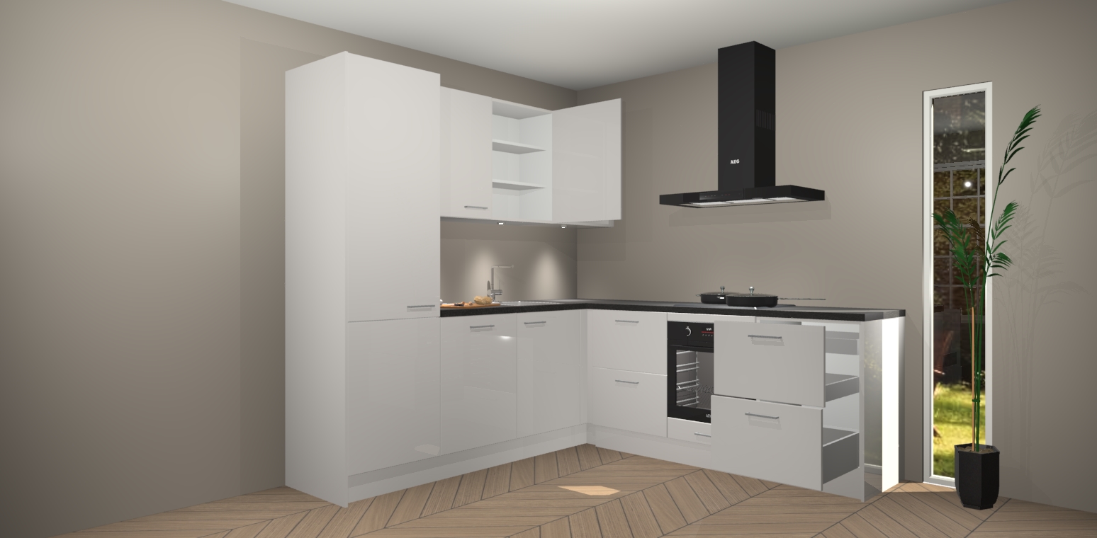 Met zijn moderne design en aantrekkelijke hoekopstelling biedt deze keuken een unieke look die zelfs de meest veeleisende huiseigenaar zal bevallen. En omdat de binnenkant van de kasten dezelfde kleur heeft als de buitenkant, heeft uw keuken een consistente afwerking. Bovenop de geweldige look is opbergruimte ook geen probleem, met voldoende kast- en laderuimte achter zelfs de mooiste buitenkant.