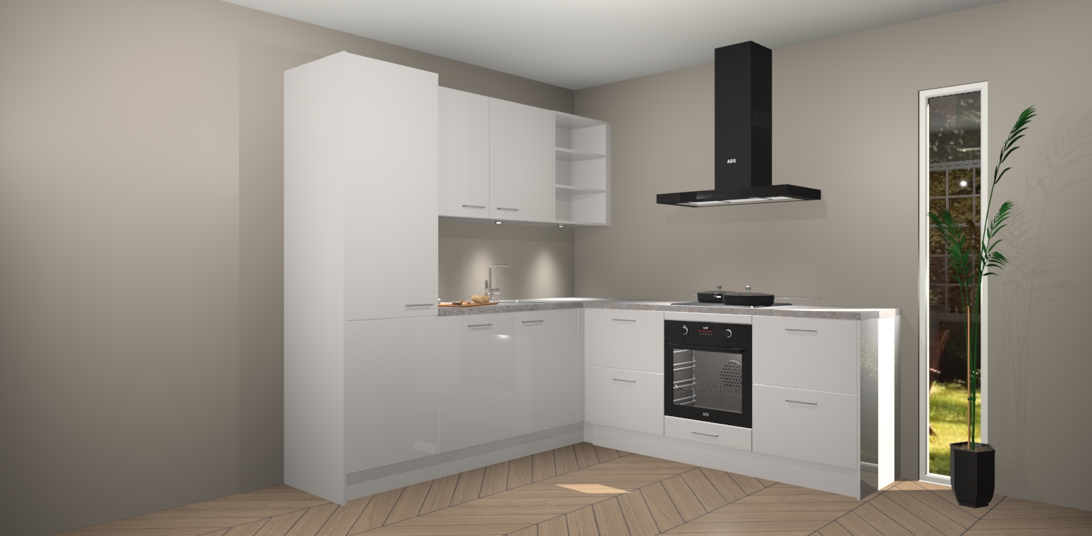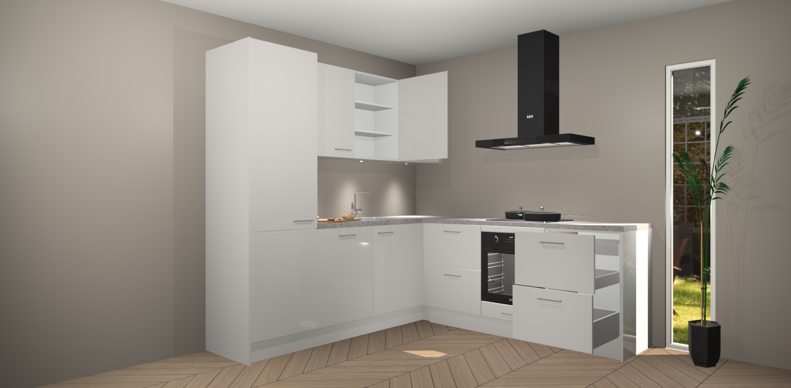 Met zijn moderne design en aantrekkelijke hoekopstelling biedt deze keuken een unieke look die zelfs de meest veeleisende huiseigenaar zal bevallen. En omdat de binnenkant van de kasten dezelfde kleur heeft als de buitenkant, heeft uw keuken een consistente afwerking. Bovenop de geweldige look is opbergruimte ook geen probleem, met voldoende kast- en laderuimte achter zelfs de mooiste buitenkant.