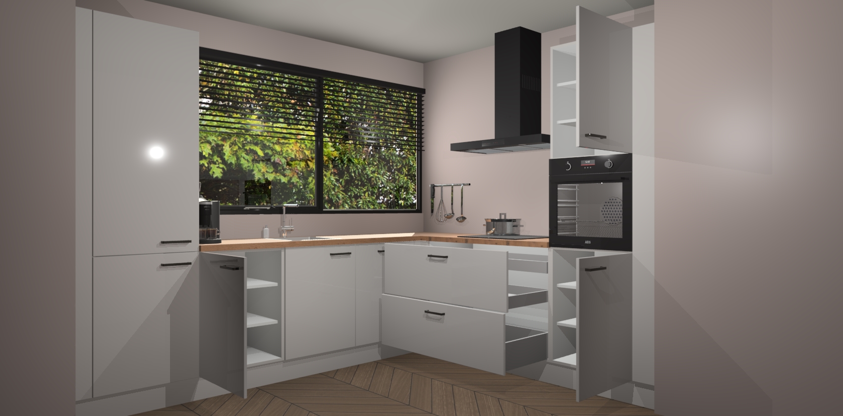 Met een modern, tijdloos design en ruime opslagruimte, zult u zich in no-time thuis voelen in uw nieuwe keuken. Uw leven wordt eenvoudiger met de soft-close deuren die voor het ultieme stille comfort zorgen - geen geluid dat u stoort terwijl u kookt. Ook is de keuken voorzien van 5 ingebouwde apparaten: een oven, inductie kookplaat, afzuigkap, vaatwasser en koelkast. Deze kunnen gemakkelijk na bestelling worden bijgewerkt naar AEG - waardoor uw luxe ervaring compleet is.