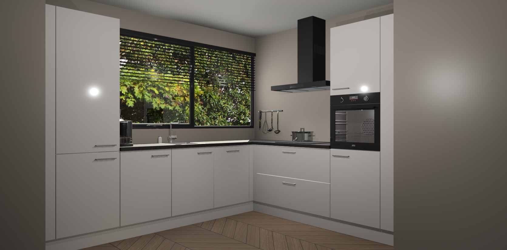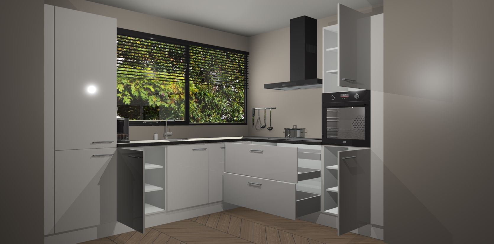Met een modern, tijdloos design en ruime opslagruimte, zult u zich in no-time thuis voelen in uw nieuwe keuken. Uw leven wordt eenvoudiger met de soft-close deuren die voor het ultieme stille comfort zorgen - geen geluid dat u stoort terwijl u kookt. Ook is de keuken voorzien van 5 ingebouwde apparaten: een oven, inductie kookplaat, afzuigkap, vaatwasser en koelkast. Deze kunnen gemakkelijk na bestelling worden bijgewerkt naar AEG - waardoor uw luxe ervaring compleet is.