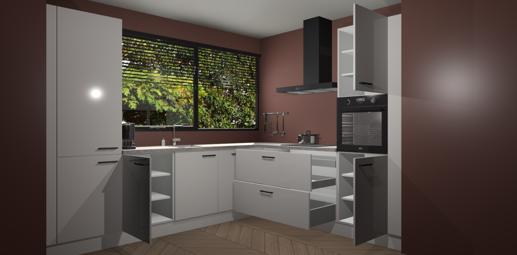 Met een modern, tijdloos design en ruime opslagruimte, zult u zich in no-time thuis voelen in uw nieuwe keuken. Uw leven wordt eenvoudiger met de soft-close deuren die voor het ultieme stille comfort zorgen - geen geluid dat u stoort terwijl u kookt. Ook is de keuken voorzien van 5 ingebouwde apparaten: een oven, inductie kookplaat, afzuigkap, vaatwasser en koelkast. Deze kunnen gemakkelijk na bestelling worden bijgewerkt naar AEG - waardoor uw luxe ervaring compleet is.
