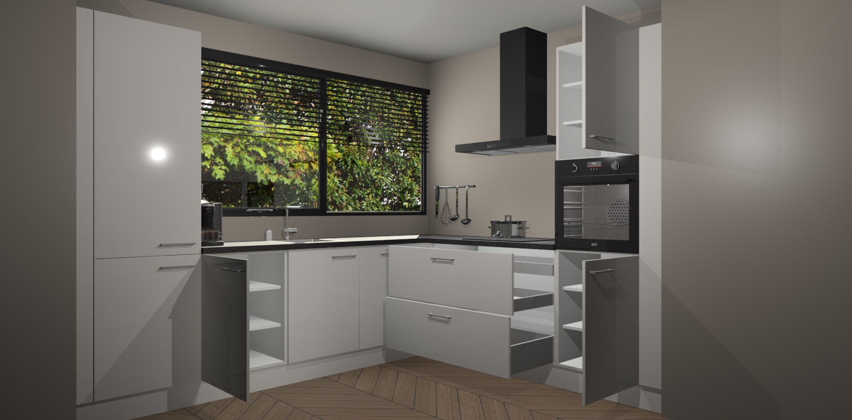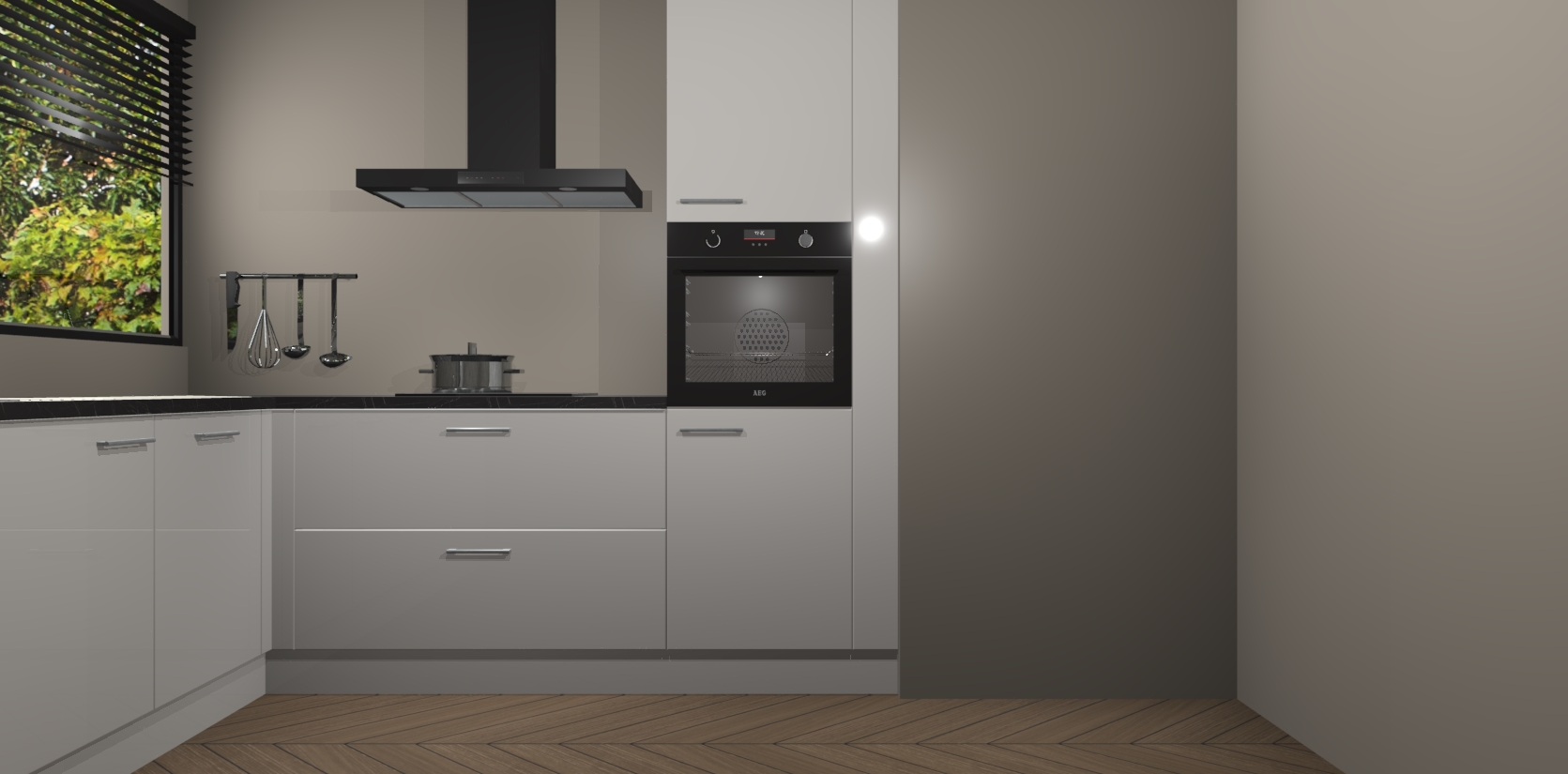 Met een modern, tijdloos design en ruime opslagruimte, zult u zich in no-time thuis voelen in uw nieuwe keuken. Uw leven wordt eenvoudiger met de soft-close deuren die voor het ultieme stille comfort zorgen - geen geluid dat u stoort terwijl u kookt. Ook is de keuken voorzien van 5 ingebouwde apparaten: een oven, inductie kookplaat, afzuigkap, vaatwasser en koelkast. Deze kunnen gemakkelijk na bestelling worden bijgewerkt naar AEG - waardoor uw luxe ervaring compleet is.