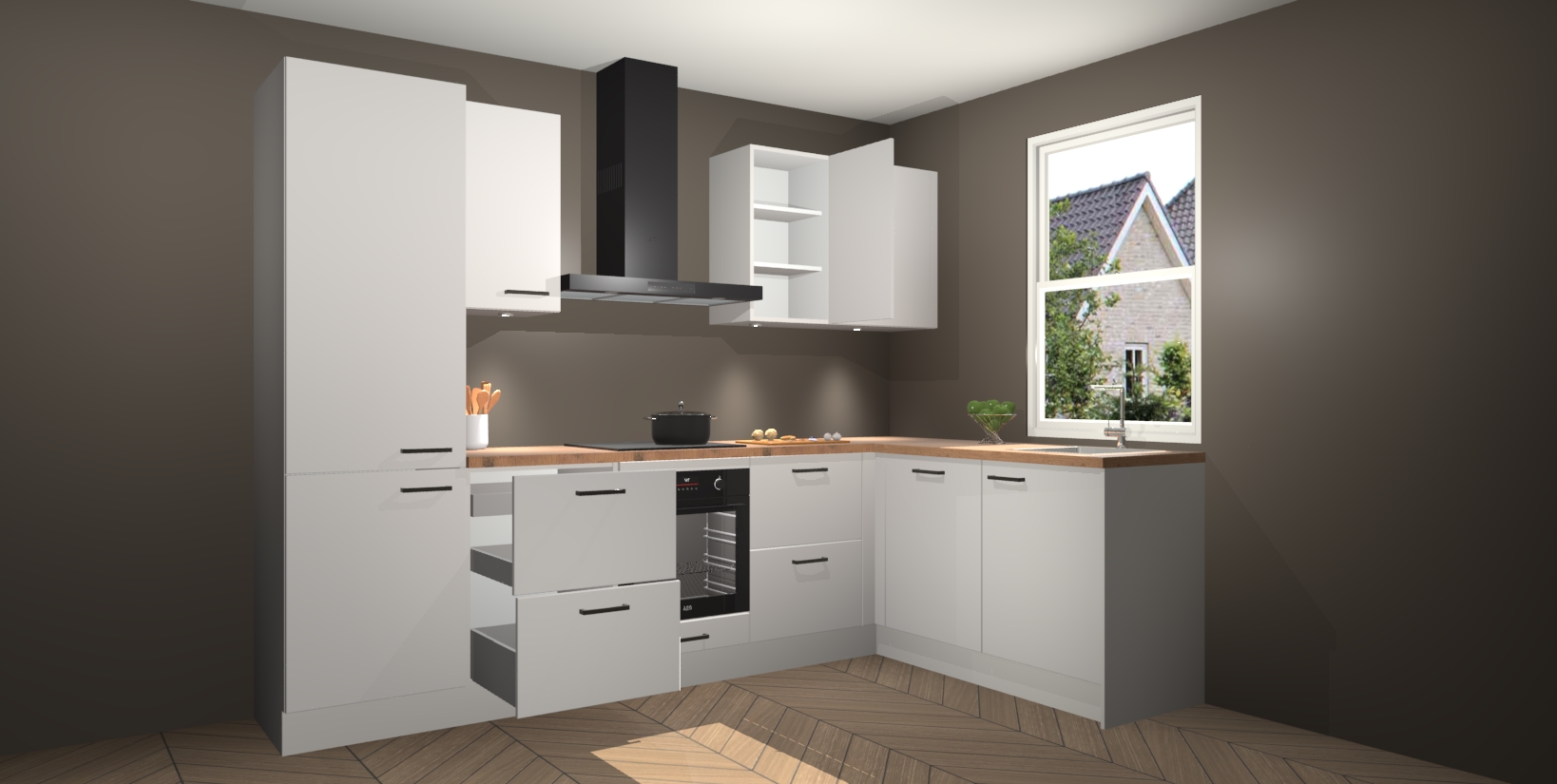In deze box zijn alle kleuren verzameld van de deuren en werkbladen. Vraag de gratis kleurenbox aan en kijk thuis rustig verder!