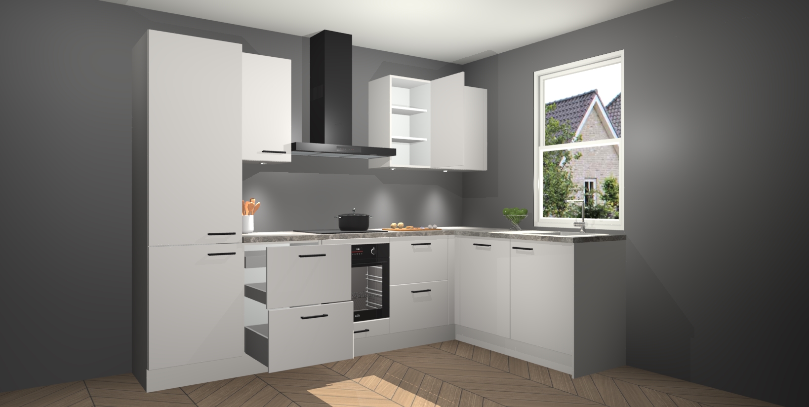 Maak kennis met de trendsettende en luxe Zijdegrijze keuken Bazel! Deze uitzonderlijke keuken van Duitse kwaliteit is stijlvol, modern en perfect om elk huis mee op te fleuren. De binnenkant van de kasten worden meegenomen in een bijpassende kleur om een samenhangende eigentijdse esthetiek te voltooien. U zult dol zijn op hoe uw pas gerenoveerde keuken eruitziet met de Zijdegrijze editie!