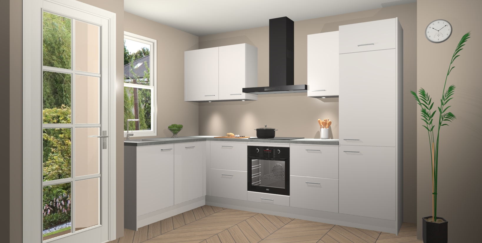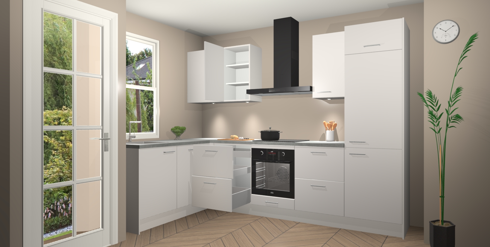 U hoeft zich ook geen zorgen te maken over een gebrek aan opbergruimte, want deze keuken heeft voldoende opbergmogelijkheden zowel boven als onder het aanrecht. Om het leven nog makkelijker te maken, wordt deze moderne hoekkeuken geleverd met 5 ingebouwde apparaten, waaronder een oven, inductiekookplaat, afzuigkap, vaatwasser en koelkast, zodat u in een mum van tijd klaar bent voor actie!