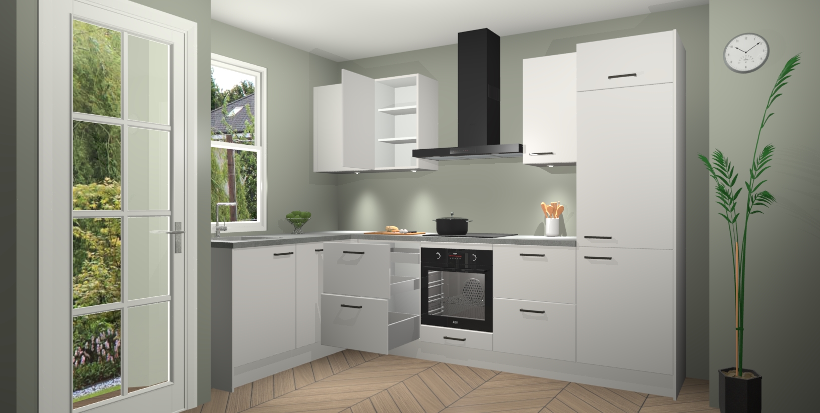 U hoeft zich ook geen zorgen te maken over een gebrek aan opbergruimte, want deze keuken heeft voldoende opbergmogelijkheden zowel boven als onder het aanrecht. Om het leven nog makkelijker te maken, wordt deze moderne hoekkeuken geleverd met 5 ingebouwde apparaten, waaronder een oven, inductiekookplaat, afzuigkap, vaatwasser en koelkast, zodat u in een mum van tijd klaar bent voor actie!