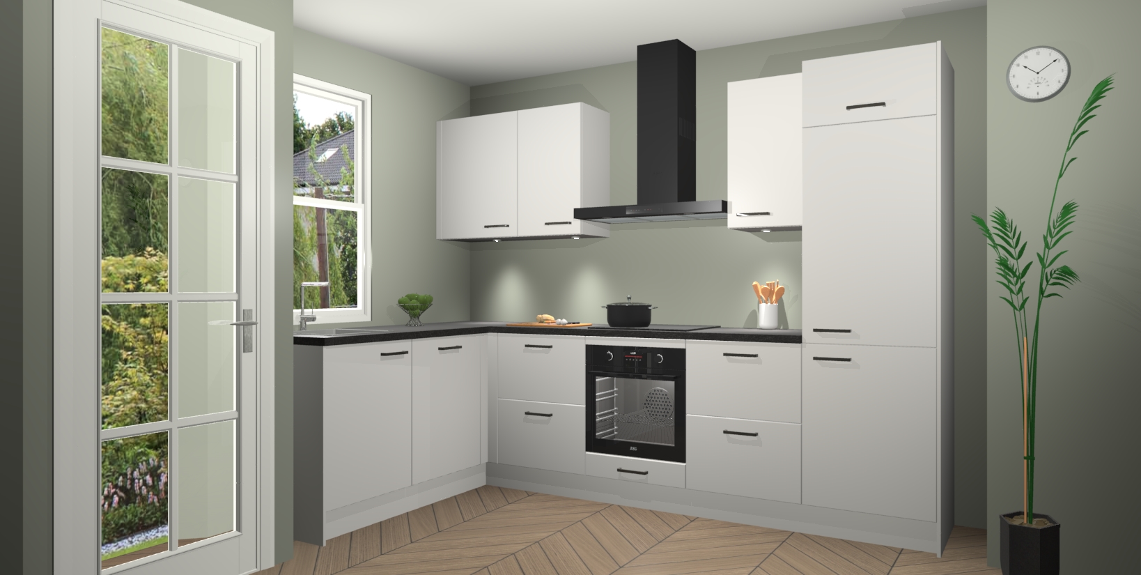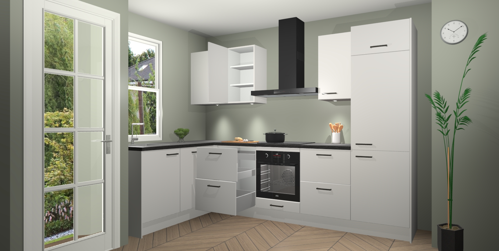 U hoeft zich ook geen zorgen te maken over een gebrek aan opbergruimte, want deze keuken heeft voldoende opbergmogelijkheden zowel boven als onder het aanrecht. Om het leven nog makkelijker te maken, wordt deze moderne hoekkeuken geleverd met 5 ingebouwde apparaten, waaronder een oven, inductiekookplaat, afzuigkap, vaatwasser en koelkast, zodat u in een mum van tijd klaar bent voor actie!