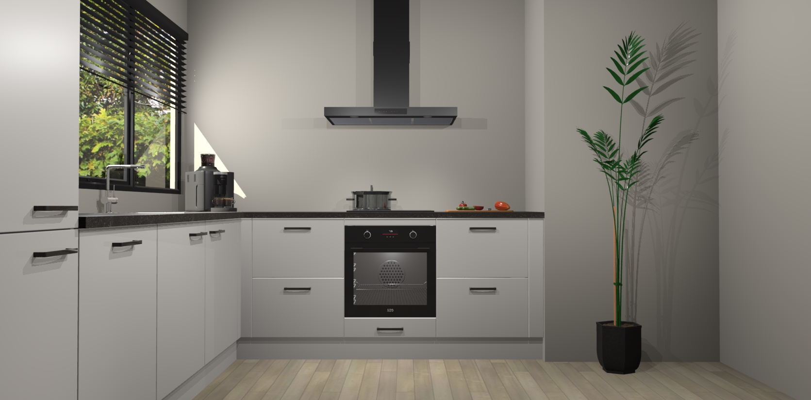 Met een modern, tijdloos design en ruime opslagruimte, zult u zich in no-time thuis voelen in uw nieuwe keuken. Uw leven wordt eenvoudiger met de soft-close deuren die voor het ultieme stille comfort zorgen - geen geluid dat u stoort terwijl u kookt. Ook is de keuken voorzien van 5 ingebouwde apparaten: een oven, inductie kookplaat, afzuigkap, vaatwasser en koelkast. Deze kunnen gemakkelijk na bestelling worden bijgewerkt naar AEG - waardoor uw luxe ervaring compleet is.