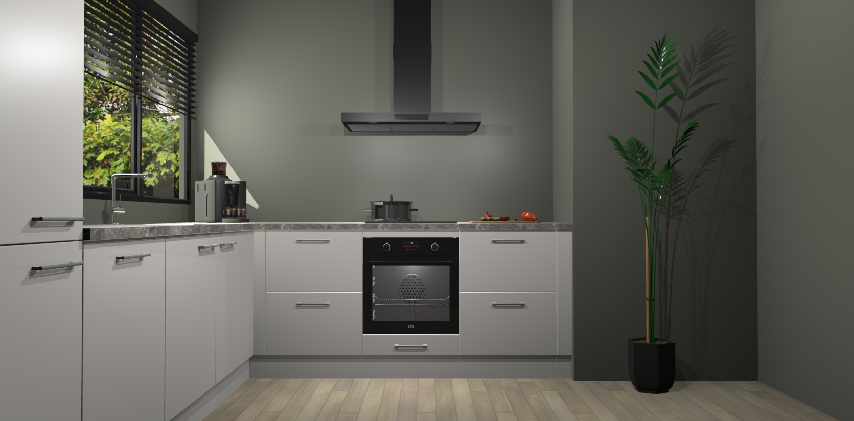Met een modern, tijdloos design en ruime opslagruimte, zult u zich in no-time thuis voelen in uw nieuwe keuken. Uw leven wordt eenvoudiger met de soft-close deuren die voor het ultieme stille comfort zorgen - geen geluid dat u stoort terwijl u kookt. Ook is de keuken voorzien van 5 ingebouwde apparaten: een oven, inductie kookplaat, afzuigkap, vaatwasser en koelkast. Deze kunnen gemakkelijk na bestelling worden bijgewerkt naar AEG - waardoor uw luxe ervaring compleet is.