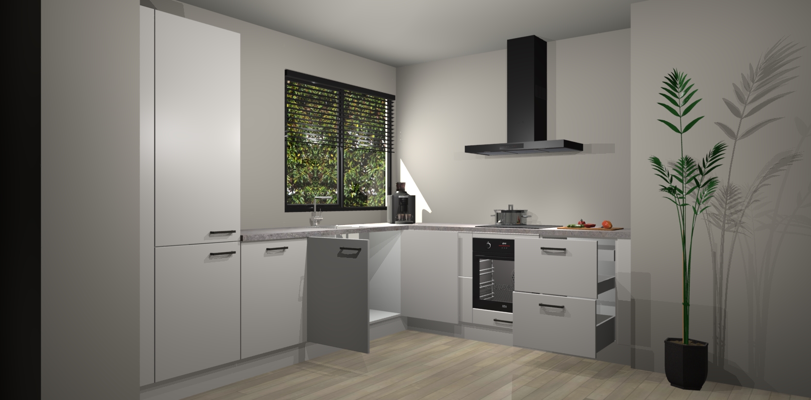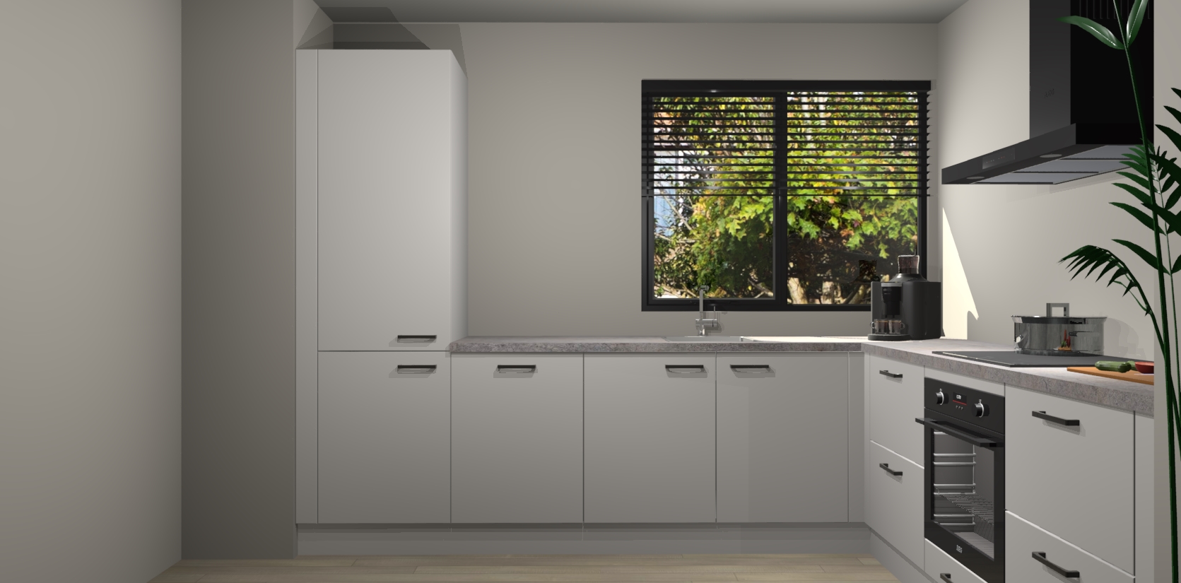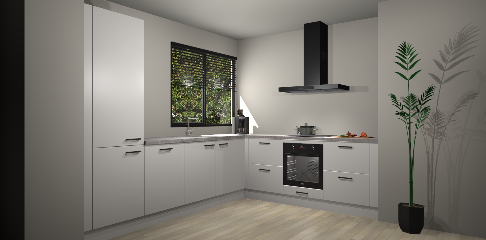Met een modern, tijdloos design en ruime opslagruimte, zult u zich in no-time thuis voelen in uw nieuwe keuken. Uw leven wordt eenvoudiger met de soft-close deuren die voor het ultieme stille comfort zorgen - geen geluid dat u stoort terwijl u kookt. Ook is de keuken voorzien van 5 ingebouwde apparaten: een oven, inductie kookplaat, afzuigkap, vaatwasser en koelkast. Deze kunnen gemakkelijk na bestelling worden bijgewerkt naar AEG - waardoor uw luxe ervaring compleet is.