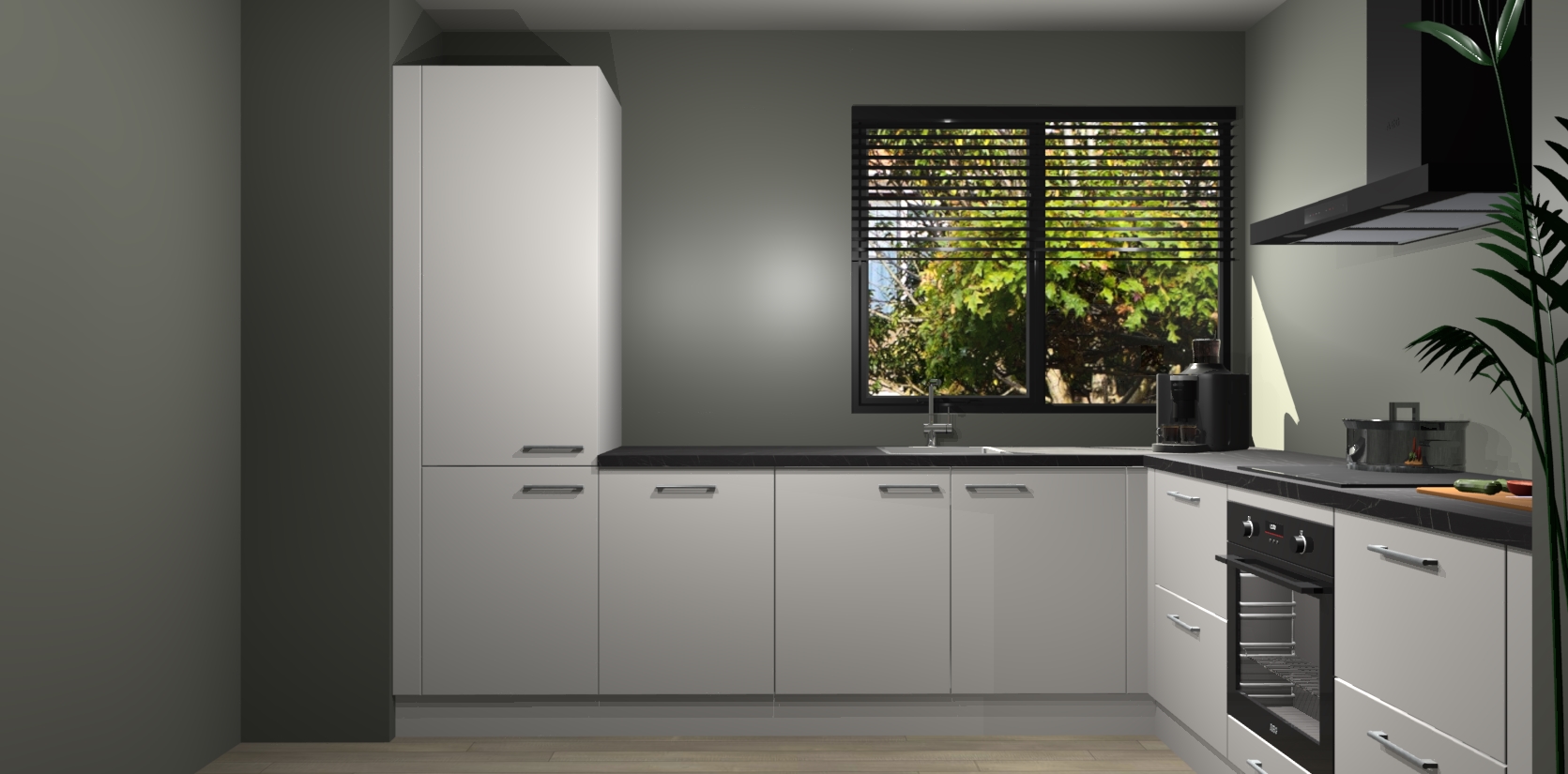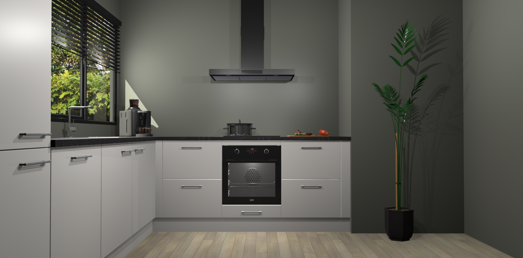Met een modern, tijdloos design en ruime opslagruimte, zult u zich in no-time thuis voelen in uw nieuwe keuken. Uw leven wordt eenvoudiger met de soft-close deuren die voor het ultieme stille comfort zorgen - geen geluid dat u stoort terwijl u kookt. Ook is de keuken voorzien van 5 ingebouwde apparaten: een oven, inductie kookplaat, afzuigkap, vaatwasser en koelkast. Deze kunnen gemakkelijk na bestelling worden bijgewerkt naar AEG - waardoor uw luxe ervaring compleet is.