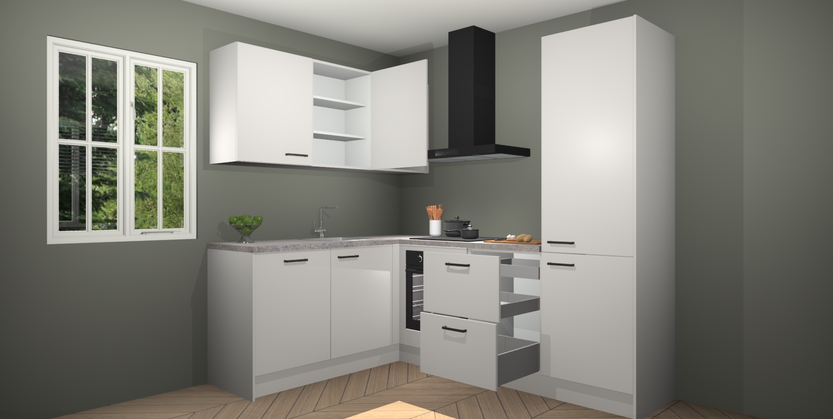 Voor nog meer gemak heeft deze keuken vijf ingebouwde apparaten - oven, inductiekookplaat, afzuigkap, vaatwasser en koelkast. Bovendien hebben alle kasten softclose deuren voor extra comfort bij het sluiten. Dit alles voor een verrassend lage vaste prijs - u vindt nergens anders een betere deal!