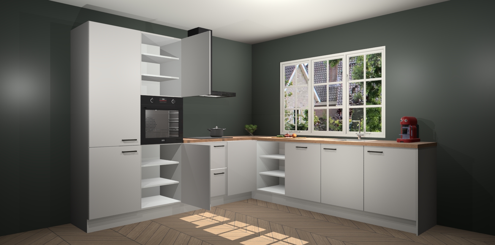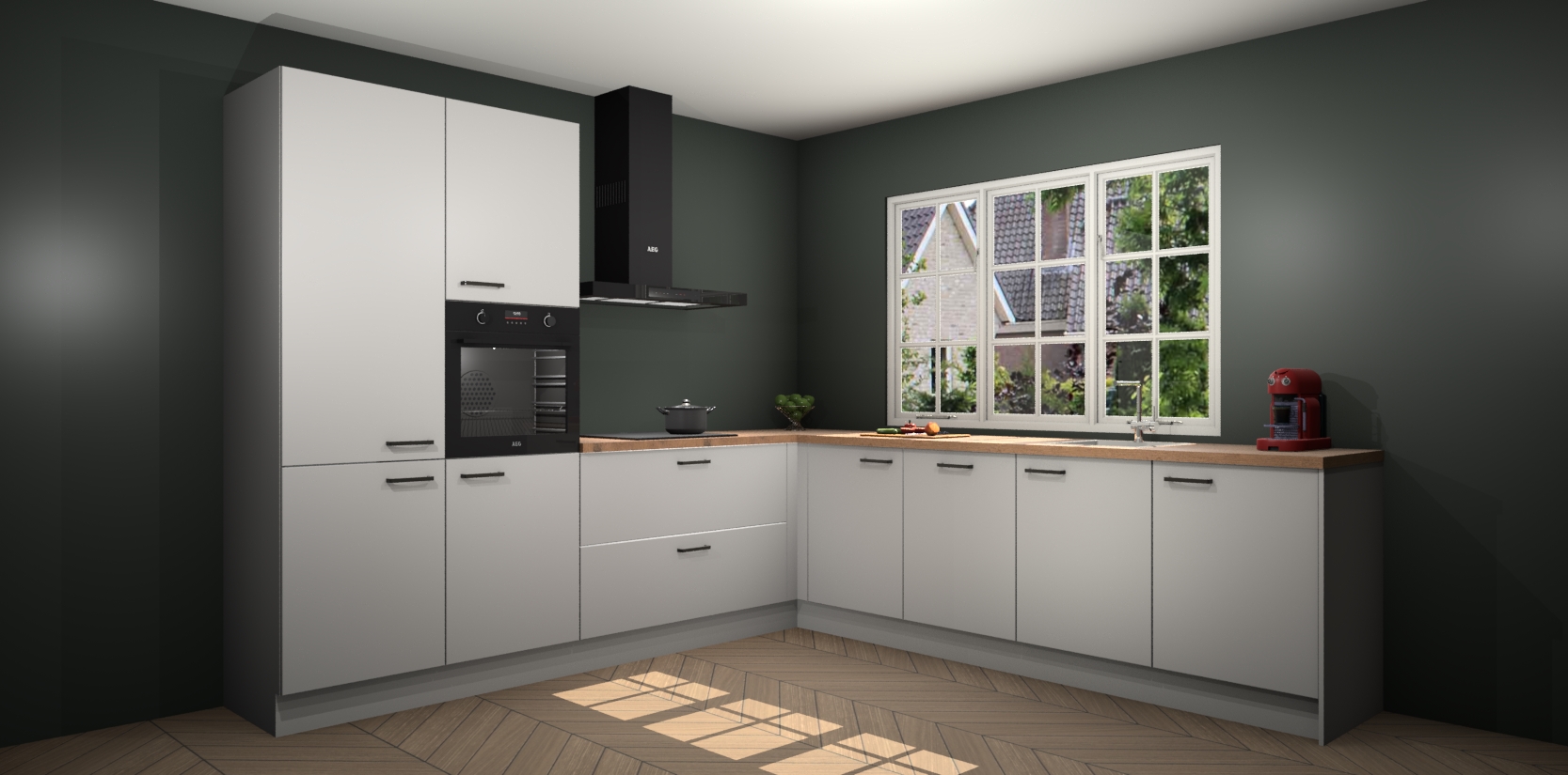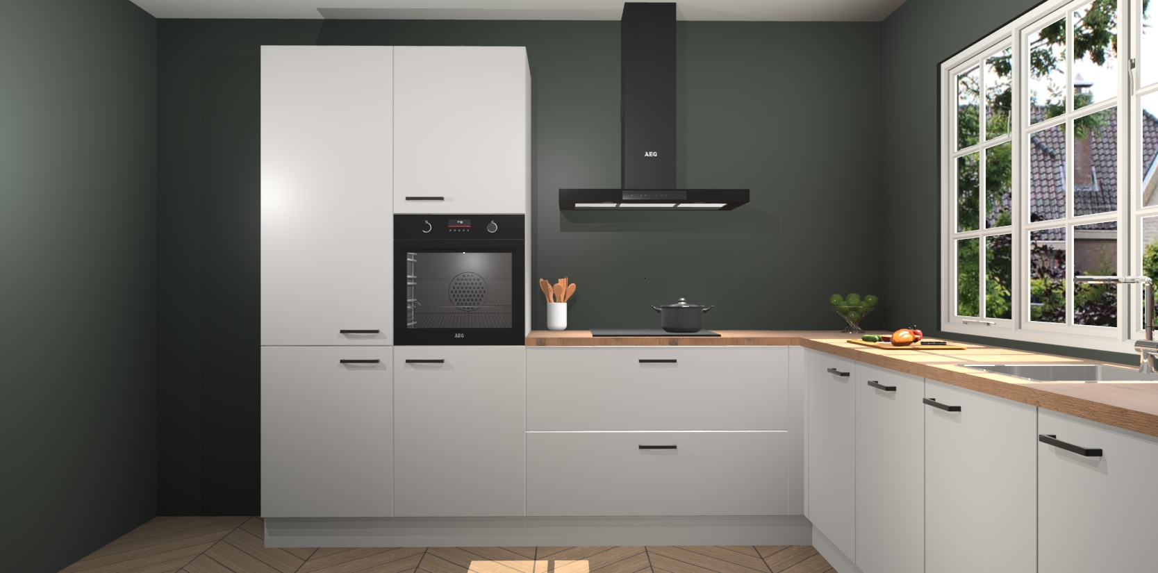 De keuken heeft veel opbergruimte, waardoor u alle ingrediënten gemakkelijk bereikbaar hebt staan. En daarnaast bevat deze volledig uitgeruste keuken ook 5 ingebouwde apparaten: een oven, inductiekookplaat, afzuigkap, vaatwasser en koelkast. Deze zijn heel eenvoudig na bestellen te upgraden naar AEG als u dit wilt. Bovendien zijn de softclose-kastdeuren ideaal; geef ze gewoon even een tikje en ze sluiten automatisch met geruisloze precisie.